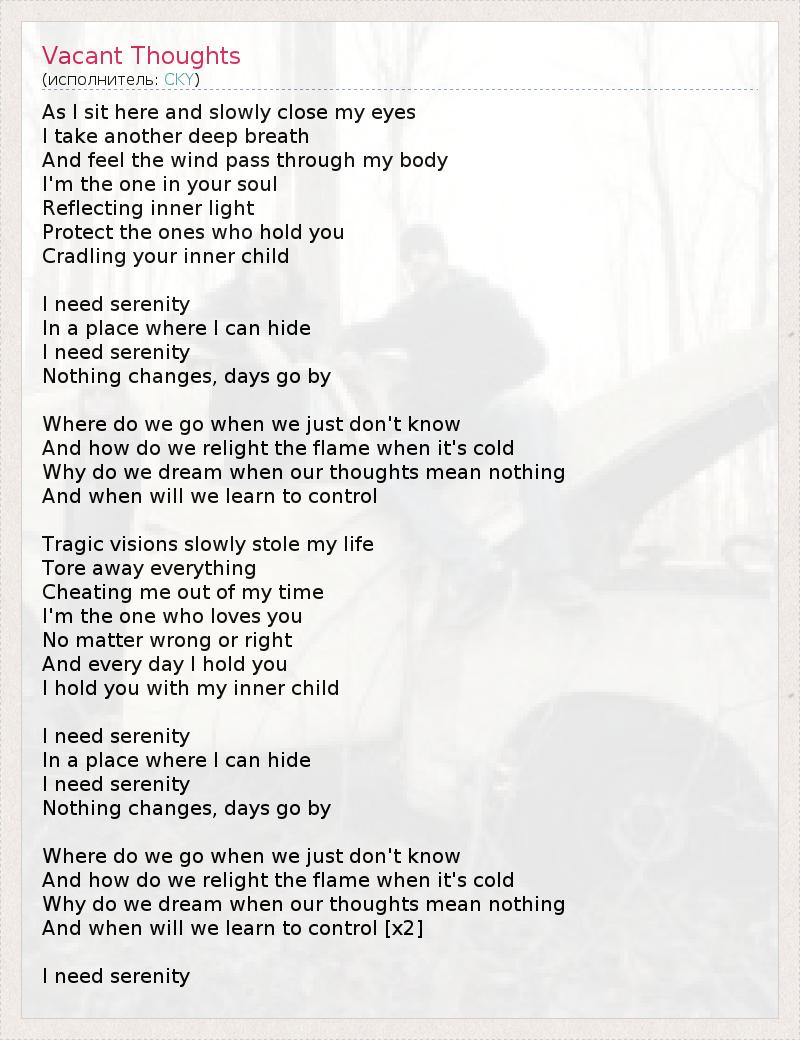 As I sit here and slowly close my eyes I take another deep breath And feel the wind pass through my body I'm the one in your soul Reflecting inner light Protect the ones who hold you Cradling your inner child I need serenity In a place where I can hide I need serenity Nothing changes, days go by Where do we go when we just don't know And how do we relight the flame when it's cold Why do we dream when our thoughts mean nothing And when will we learn to control Tragic visions slowly stole my life Tore away everything Cheating me out of my time I'm the one who loves you No matter wrong or right And every day I hold you I hold you with my inner child I need serenity In a place where I can hide I need serenity Nothing changes, days go by Where do we go when we just don't know And how do we relight the flame when it's cold Why do we dream when our thoughts mean nothing And when will we learn to control [x2] I need serenity
