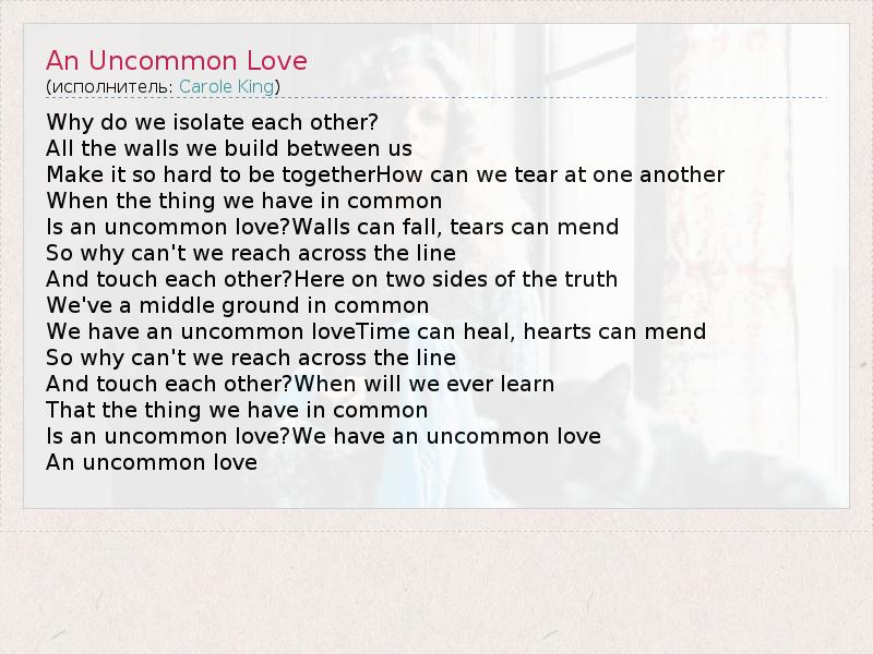 А как ты думаешь, о чем песня "An Uncommon Love" ?