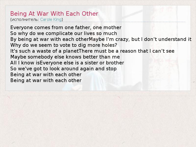 А как ты думаешь, о чем песня "Being At War With Each Other" ?