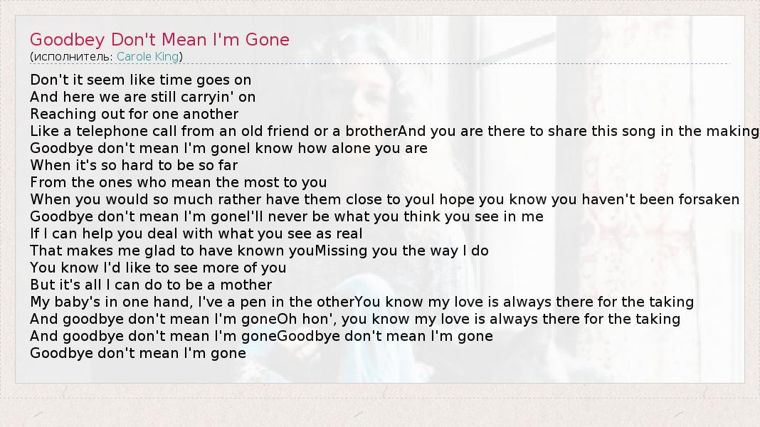 А как ты думаешь, о чем песня "Goodbey Don't Mean I'm Gone" ?