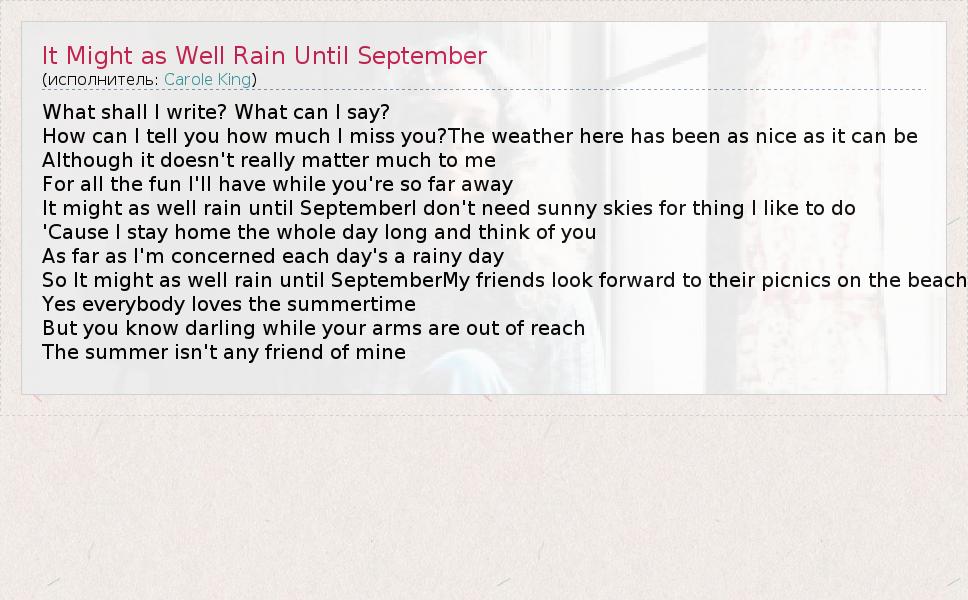 What shall I write? What can I say? How can I tell you how much I miss you?The weather here has been as nice as it can be Although it doesn't really matter much to me For all the fun I'll have while you're so far away It might as well rain until SeptemberI don't need sunny skies for thing I like to do 'Cause I stay home the whole day long and think of you As far as I'm concerned each day's a rainy day So It might as well rain until SeptemberMy friends look forward to their picnics on the beach Yes everybody loves the summertime But you know darling while your arms are out of reach The summer isn't any friend of mine