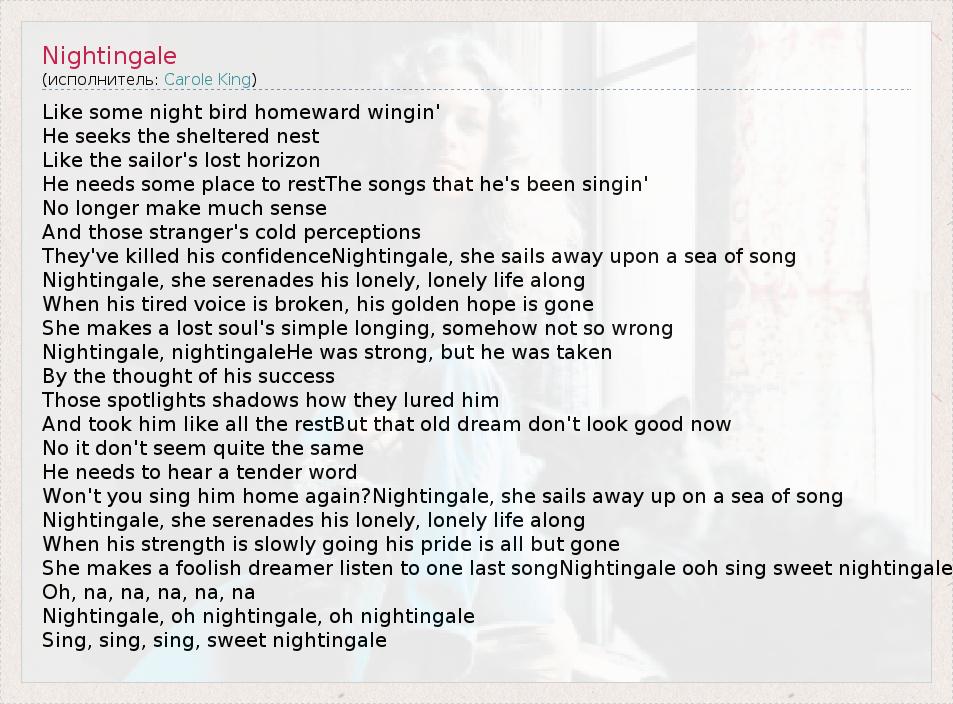 Like some night bird homeward wingin' He seeks the sheltered nest Like the sailor's lost horizon He needs some place to restThe songs that he's been singin' No longer make much sense And those stranger's cold perceptions They've killed his confidenceNightingale, she sails away upon a sea of song Nightingale, she serenades his lonely, lonely life along When his tired voice is broken, his golden hope is gone She makes a lost soul's simple longing, somehow not so wrong Nightingale, nightingaleHe was strong, but he was taken By the thought of his success Those spotlights shadows how they lured him And took him like all the restBut that old dream don't look good now No it don't seem quite the same He needs to hear a tender word Won't you sing him home again?Nightingale, she sails away up on a sea of song Nightingale, she serenades his lonely, lonely life along When his strength is slowly going his pride is all but gone She makes a foolish dreamer listen to one last songNightingale ooh sing sweet nightingale Oh, na, na, na, na, na Nightingale, oh nightingale, oh nightingale Sing, sing, sing, sweet nightingale