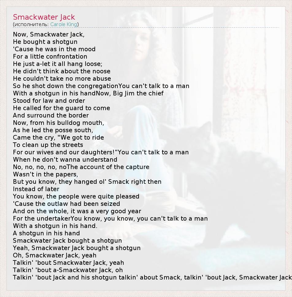 Now, Smackwater Jack, He bought a shotgun 'Cause he was in the mood For a little confrontation He just a-let it all hang loose; He didn't think about the noose He couldn't take no more abuse So he shot down the congregationYou can't talk to a man With a shotgun in his handNow, Big Jim the chief Stood for law and order He called for the guard to come And surround the border Now, from his bulldog mouth, As he led the posse south, Came the cry, "We got to ride To clean up the streets For our wives and our daughters!"You can't talk to a man When he don't wanna understand No, no, no, no, noThe account of the capture Wasn't in the papers, But you know, they hanged ol' Smack right then Instead of later You know, the people were quite pleased 'Cause the outlaw had been seized And on the whole, it was a very good year For the undertakerYou know, you know, you can't talk to a man With a shotgun in his hand. A shotgun in his hand Smackwater Jack bought a shotgun Yeah, Smackwater Jack bought a shotgun Oh, Smackwater Jack, yeah Talkin' 'bout Smackwater Jack, yeah Talkin' 'bout a-Smackwater Jack, oh Talkin' 'bout Jack and his shotgun talkin' about Smack, talkin' 'bout Jack, Smackwater Jack
