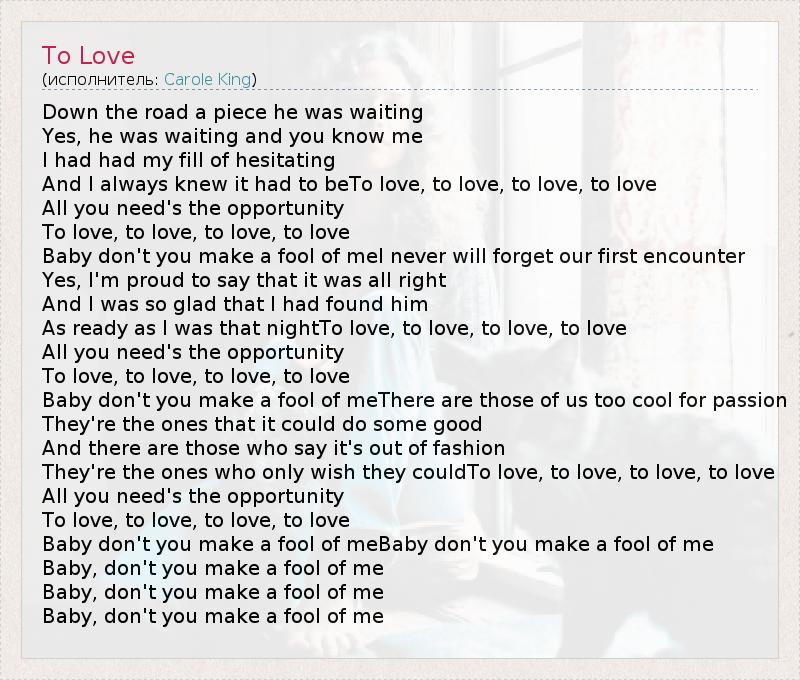 Down the road a piece he was waiting Yes, he was waiting and you know me I had had my fill of hesitating And I always knew it had to beTo love, to love, to love, to love All you need's the opportunity To love, to love, to love, to love Baby don't you make a fool of meI never will forget our first encounter Yes, I'm proud to say that it was all right And I was so glad that I had found him As ready as I was that nightTo love, to love, to love, to love All you need's the opportunity To love, to love, to love, to love Baby don't you make a fool of meThere are those of us too cool for passion They're the ones that it could do some good And there are those who say it's out of fashion They're the ones who only wish they couldTo love, to love, to love, to love All you need's the opportunity To love, to love, to love, to love Baby don't you make a fool of meBaby don't you make a fool of me Baby, don't you make a fool of me Baby, don't you make a fool of me Baby, don't you make a fool of me