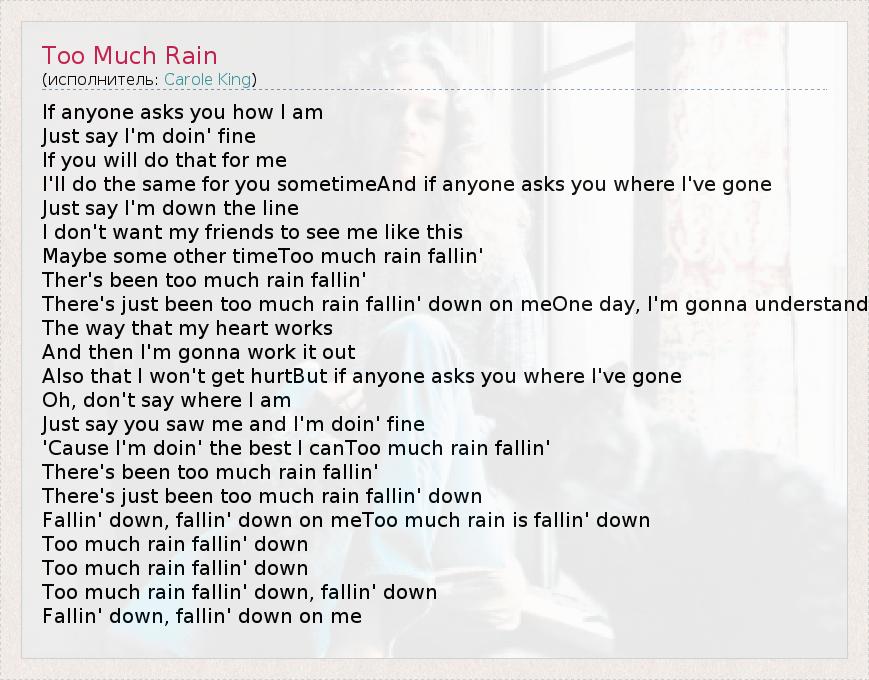 If anyone asks you how I am Just say I'm doin' fine If you will do that for me I'll do the same for you sometimeAnd if anyone asks you where I've gone Just say I'm down the line I don't want my friends to see me like this Maybe some other timeToo much rain fallin' Ther's been too much rain fallin' There's just been too much rain fallin' down on meOne day, I'm gonna understand The way that my heart works And then I'm gonna work it out Also that I won't get hurtBut if anyone asks you where I've gone Oh, don't say where I am Just say you saw me and I'm doin' fine 'Cause I'm doin' the best I canToo much rain fallin' There's been too much rain fallin' There's just been too much rain fallin' down Fallin' down, fallin' down on meToo much rain is fallin' down Too much rain fallin' down Too much rain fallin' down Too much rain fallin' down, fallin' down Fallin' down, fallin' down on me