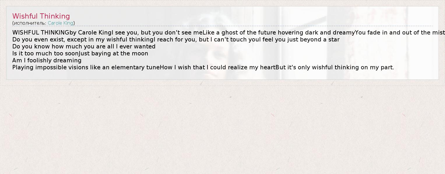 WISHFUL THINKINGby Carole KingI see you, but you don't see meLike a ghost of the future hovering dark and dreamyYou fade in and out of the mist Do you even exist, except in my wishful thinkingI reach for you, but I can't touch youI feel you just beyond a star Do you know how much you are all I ever wanted Is it too much too soonJust baying at the moon Am I foolishly dreaming Playing impossible visions like an elementary tuneHow I wish that I could realize my heartBut it's only wishful thinking on my part.