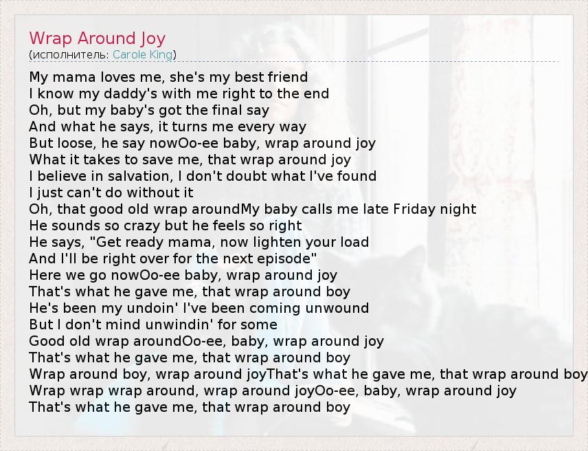My mama loves me, she's my best friend I know my daddy's with me right to the end Oh, but my baby's got the final say And what he says, it turns me every way But loose, he say nowOo-ee baby, wrap around joy What it takes to save me, that wrap around joy I believe in salvation, I don't doubt what I've found I just can't do without it Oh, that good old wrap aroundMy baby calls me late Friday night He sounds so crazy but he feels so right He says, "Get ready mama, now lighten your load And I'll be right over for the next episode" Here we go nowOo-ee baby, wrap around joy That's what he gave me, that wrap around boy He's been my undoin' I've been coming unwound But I don't mind unwindin' for some Good old wrap aroundOo-ee, baby, wrap around joy That's what he gave me, that wrap around boy Wrap around boy, wrap around joyThat's what he gave me, that wrap around boy Wrap wrap wrap around, wrap around joyOo-ee, baby, wrap around joy That's what he gave me, that wrap around boy