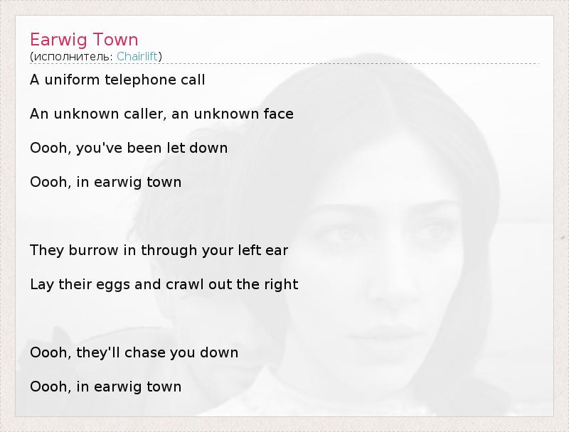A uniform telephone call An unknown caller, an unknown face Oooh, you've been let down Oooh, in earwig town They burrow in through your left ear Lay their eggs and crawl out the right Oooh, they'll chase you down Oooh, in earwig town