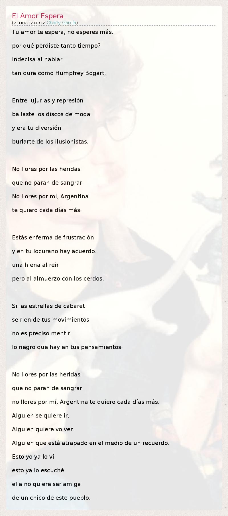 Tu amor te espera, no esperes más. por qué perdiste tanto tiempo? Indecisa al hablar tan dura como Humpfrey Bogart, Entre lujurias y represión bailaste los discos de moda y era tu diversión burlarte de los ilusionistas. No llores por las heridas que no paran de sangrar. No llores por mí, Argentina te quiero cada días más. Estás enferma de frustración y en tu locurano hay acuerdo. una hiena al reir pero al almuerzo con los cerdos. Si las estrellas de cabaret se rien de tus movimientos no es preciso mentir lo negro que hay en tus pensamientos. No llores por las heridas que no paran de sangrar. no llores por mí, Argentina te quiero cada días más. Alguien se quiere ir. Alguien quiere volver. Alguien que está atrapado en el medio de un recuerdo. Esto yo ya lo ví esto ya lo escuché ella no quiere ser amiga de un chico de este pueblo.