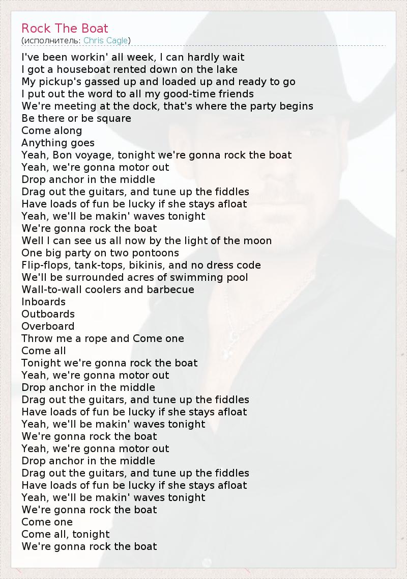 I've been workin' all week, I can hardly wait I got a houseboat rented down on the lake My pickup's gassed up and loaded up and ready to go I put out the word to all my good-time friends We're meeting at the dock, that's where the party begins Be there or be square Come along Anything goes Yeah, Bon voyage, tonight we're gonna rock the boat Yeah, we're gonna motor out Drop anchor in the middle Drag out the guitars, and tune up the fiddles Have loads of fun be lucky if she stays afloat Yeah, we'll be makin' waves tonight We're gonna rock the boat Well I can see us all now by the light of the moon One big party on two pontoons Flip-flops, tank-tops, bikinis, and no dress code We'll be surrounded acres of swimming pool Wall-to-wall coolers and barbecue Inboards Outboards Overboard Throw me a rope and Come one Come all Tonight we're gonna rock the boat Yeah, we're gonna motor out Drop anchor in the middle Drag out the guitars, and tune up the fiddles Have loads of fun be lucky if she stays afloat Yeah, we'll be makin' waves tonight We're gonna rock the boat Yeah, we're gonna motor out Drop anchor in the middle Drag out the guitars, and tune up the fiddles Have loads of fun be lucky if she stays afloat Yeah, we'll be makin' waves tonight We're gonna rock the boat Come one Come all, tonight We're gonna rock the boat