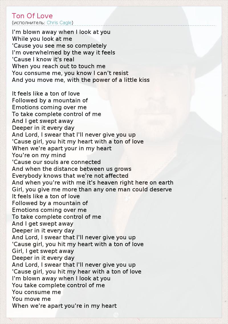 I'm blown away when I look at you While you look at me 'Cause you see me so completely I'm overwhelmed by the way it feels 'Cause I know it's real When you reach out to touch me You consume me, you know I can't resist And you move me, with the power of a little kiss It feels like a ton of love Followed by a mountain of Emotions coming over me To take complete control of me And I get swept away Deeper in it every day And Lord, I swear that I'll never give you up 'Cause girl, you hit my heart with a ton of love When we're apart your in my heart You're on my mind 'Cause our souls are connected And when the distance between us grows Everybody knows that we're not affected And when you're with me it's heaven right here on earth Girl, you give me more than any one man could deserve It feels like a ton of love Followed by a mountain of Emotions coming over me To take complete control of me And I get swept away Deeper in it every day And Lord, I swear that I'll never give you up 'Cause girl, you hit my heart with a ton of love Girl, I get swept away Deeper in it every day And Lord, I swear that I'll never give you up 'Cause girl, you hit my hear with a ton of love I'm blown away when I look at you You take complete control of me You consume me You move me When we're apart you're in my heart