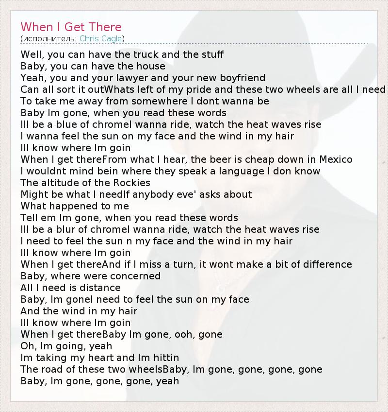 Well, you can have the truck and the stuff Baby, you can have the house Yeah, you and your lawyer and your new boyfriend Can all sort it outWhats left of my pride and these two wheels are all I need To take me away from somewhere I dont wanna be Baby Im gone, when you read these words Ill be a blue of chromeI wanna ride, watch the heat waves rise I wanna feel the sun on my face and the wind in my hair Ill know where Im goin When I get thereFrom what I hear, the beer is cheap down in Mexico I wouldnt mind bein where they speak a language I don know The altitude of the Rockies Might be what I needIf anybody eve' asks about What happened to me Tell em Im gone, when you read these words Ill be a blur of chromeI wanna ride, watch the heat waves rise I need to feel the sun n my face and the wind in my hair Ill know where Im goin When I get thereAnd if I miss a turn, it wont make a bit of difference Baby, where were concerned All I need is distance Baby, Im goneI need to feel the sun on my face And the wind in my hair Ill know where Im goin When I get thereBaby Im gone, ooh, gone Oh, Im going, yeah Im taking my heart and Im hittin The road of these two wheelsBaby, Im gone, gone, gone, gone Baby, Im gone, gone, gone, yeah