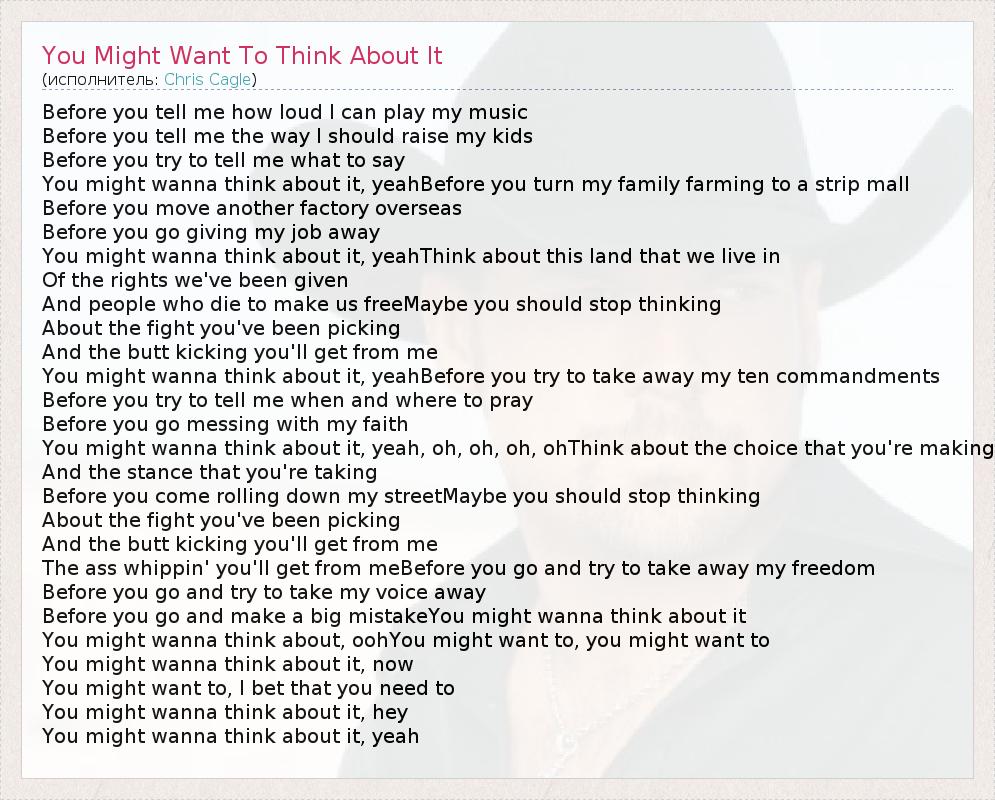 Before you tell me how loud I can play my music Before you tell me the way I should raise my kids Before you try to tell me what to say You might wanna think about it, yeahBefore you turn my family farming to a strip mall Before you move another factory overseas Before you go giving my job away You might wanna think about it, yeahThink about this land that we live in Of the rights we've been given And people who die to make us freeMaybe you should stop thinking About the fight you've been picking And the butt kicking you'll get from me You might wanna think about it, yeahBefore you try to take away my ten commandments Before you try to tell me when and where to pray Before you go messing with my faith You might wanna think about it, yeah, oh, oh, oh, ohThink about the choice that you're making And the stance that you're taking Before you come rolling down my streetMaybe you should stop thinking About the fight you've been picking And the butt kicking you'll get from me The ass whippin' you'll get from meBefore you go and try to take away my freedom Before you go and try to take my voice away Before you go and make a big mistakeYou might wanna think about it You might wanna think about, oohYou might want to, you might want to You might wanna think about it, now You might want to, I bet that you need to You might wanna think about it, hey You might wanna think about it, yeah