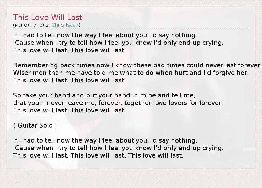 If I had to tell now the way I feel about you I'd say nothing. 'Cause when I try to tell how I feel you know I'd only end up crying. This love will last. This love will last. Remembering back times now I know these bad times could never last forever. Wiser men than me have told me what to do when hurt and I'd forgive her. This love will last. This love will last. So take your hand and put your hand in mine and tell me, that you'll never leave me, forever, together, two lovers for forever. This love will last. This love will last. ( Guitar Solo ) If I had to tell now the way I feel about you I'd say nothing. 'Cause when I try to tell how I feel you know I'd only end up crying. This love will last. This love will last. This love will last.