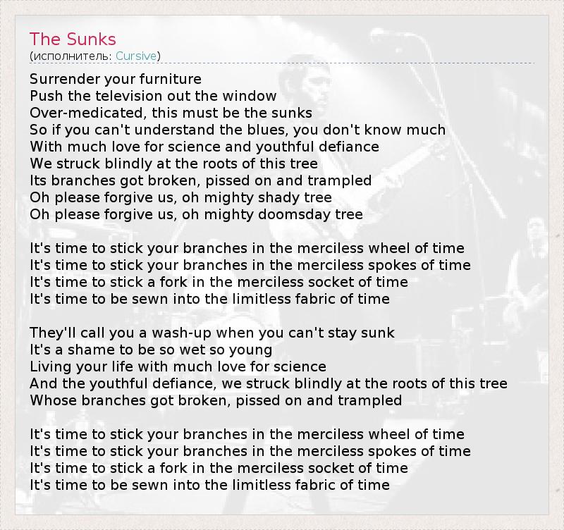 Surrender your furniture Push the television out the window Over-medicated, this must be the sunks So if you can't understand the blues, you don't know much With much love for science and youthful defiance We struck blindly at the roots of this tree Its branches got broken, pissed on and trampled Oh please forgive us, oh mighty shady tree Oh please forgive us, oh mighty doomsday tree It's time to stick your branches in the merciless wheel of time It's time to stick your branches in the merciless spokes of time It's time to stick a fork in the merciless socket of time It's time to be sewn into the limitless fabric of time They'll call you a wash-up when you can't stay sunk It's a shame to be so wet so young Living your life with much love for science And the youthful defiance, we struck blindly at the roots of this tree Whose branches got broken, pissed on and trampled It's time to stick your branches in the merciless wheel of time It's time to stick your branches in the merciless spokes of time It's time to stick a fork in the merciless socket of time It's time to be sewn into the limitless fabric of time