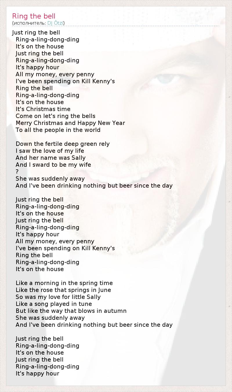 Just ring the bell Ring-a-ling-dong-ding It's on the house Just ring the bell Ring-a-ling-dong-ding It's happy hour All my money, every penny I've been spending on Kill Kenny's Ring the bell Ring-a-ling-dong-ding It's on the house It's Christmas time Come on let's ring the bells Merry Christmas and Happy New Year To all the people in the world Down the fertile deep green rely I saw the love of my life And her name was Sally And I sward to be my wife ? She was suddenly away And I've been drinking nothing but beer since the day Just ring the bell Ring-a-ling-dong-ding It's on the house Just ring the bell Ring-a-ling-dong-ding It's happy hour All my money, every penny I've been spending on Kill Kenny's Ring the bell Ring-a-ling-dong-ding It's on the house Like a morning in the spring time Like the rose that springs in June So was my love for little Sally Like a song played in tune But like the way that blows in autumn She was suddenly away And I've been drinking nothing but beer since the day Just ring the bell Ring-a-ling-dong-ding It's on the house Just ring the bell Ring-a-ling-dong-ding It's happy hour