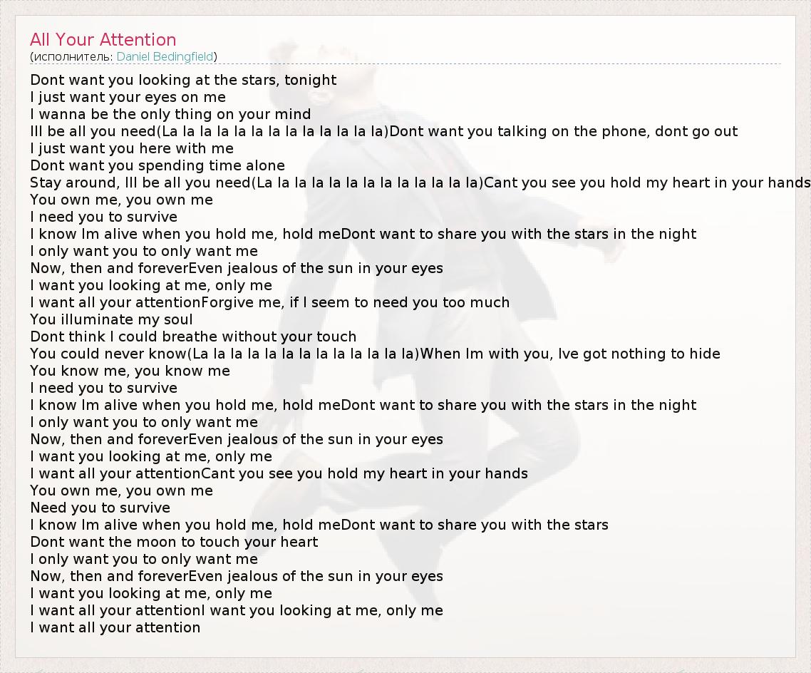 Dont want you looking at the stars, tonight I just want your eyes on me I wanna be the only thing on your mind Ill be all you need(La la la la la la la la la la la la la)Dont want you talking on the phone, dont go out I just want you here with me Dont want you spending time alone Stay around, Ill be all you need(La la la la la la la la la la la la la)Cant you see you hold my heart in your hands You own me, you own me I need you to survive I know Im alive when you hold me, hold meDont want to share you with the stars in the night I only want you to only want me Now, then and foreverEven jealous of the sun in your eyes I want you looking at me, only me I want all your attentionForgive me, if I seem to need you too much You illuminate my soul Dont think I could breathe without your touch You could never know(La la la la la la la la la la la la la)When Im with you, Ive got nothing to hide You know me, you know me I need you to survive I know Im alive when you hold me, hold meDont want to share you with the stars in the night I only want you to only want me Now, then and foreverEven jealous of the sun in your eyes I want you looking at me, only me I want all your attentionCant you see you hold my heart in your hands You own me, you own me Need you to survive I know Im alive when you hold me, hold meDont want to share you with the stars Dont want the moon to touch your heart I only want you to only want me Now, then and foreverEven jealous of the sun in your eyes I want you looking at me, only me I want all your attentionI want you looking at me, only me I want all your attention
