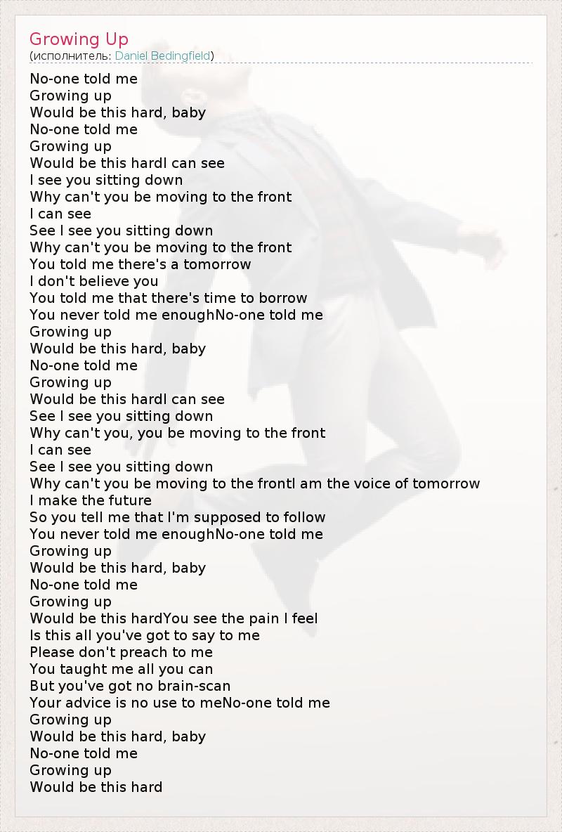 No-one told me Growing up Would be this hard, baby No-one told me Growing up Would be this hardI can see I see you sitting down Why can't you be moving to the front I can see See I see you sitting down Why can't you be moving to the front You told me there's a tomorrow I don't believe you You told me that there's time to borrow You never told me enoughNo-one told me Growing up Would be this hard, baby No-one told me Growing up Would be this hardI can see See I see you sitting down Why can't you, you be moving to the front I can see See I see you sitting down Why can't you be moving to the frontI am the voice of tomorrow I make the future So you tell me that I'm supposed to follow You never told me enoughNo-one told me Growing up Would be this hard, baby No-one told me Growing up Would be this hardYou see the pain I feel Is this all you've got to say to me Please don't preach to me You taught me all you can But you've got no brain-scan Your advice is no use to meNo-one told me Growing up Would be this hard, baby No-one told me Growing up Would be this hard