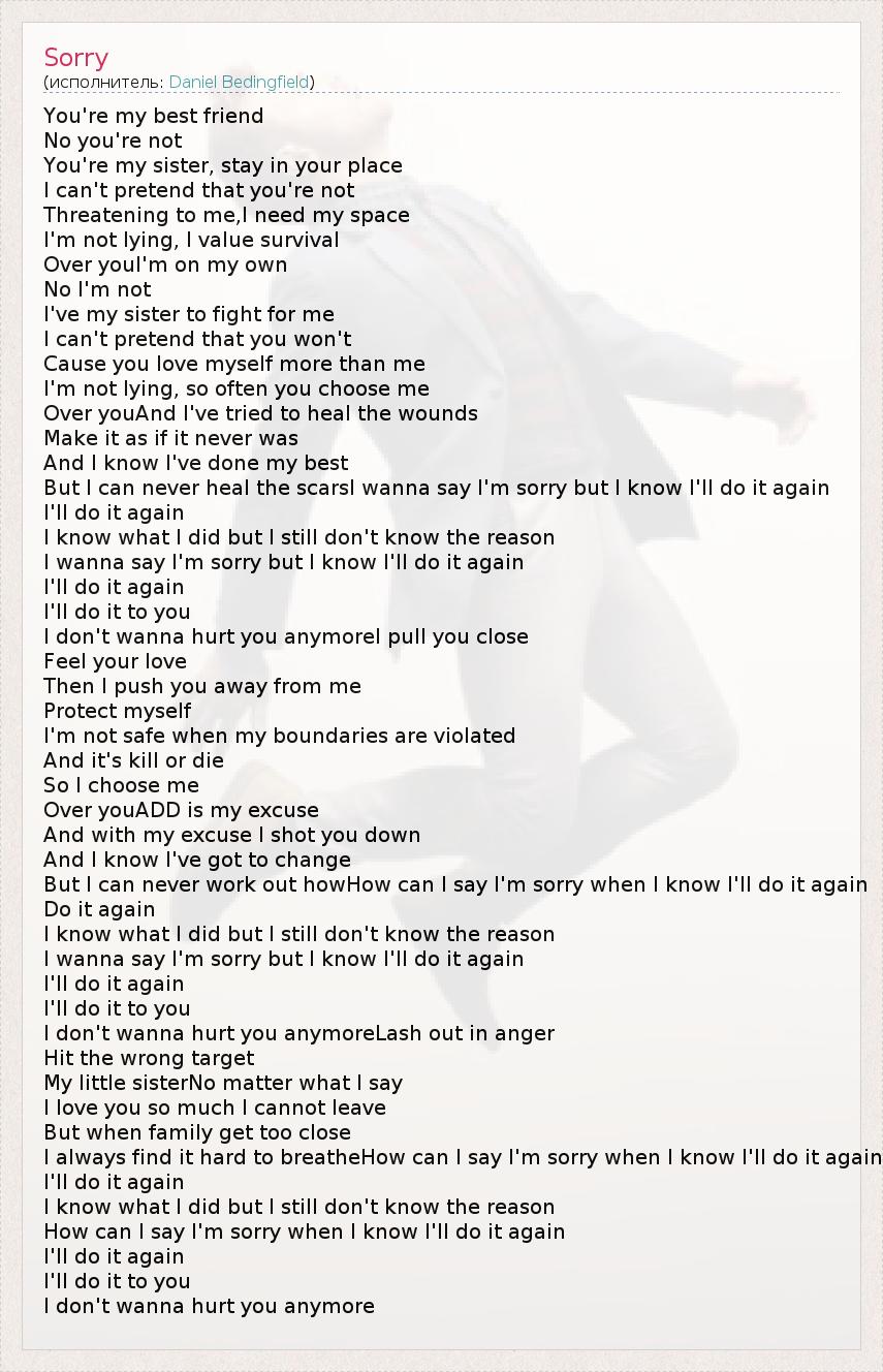 You're my best friend No you're not You're my sister, stay in your place I can't pretend that you're not Threatening to me,l need my space I'm not lying, I value survival Over youI'm on my own No I'm not I've my sister to fight for me I can't pretend that you won't Cause you love myself more than me I'm not lying, so often you choose me Over youAnd I've tried to heal the wounds Make it as if it never was And I know I've done my best But I can never heal the scarsI wanna say I'm sorry but I know I'll do it again I'll do it again I know what I did but I still don't know the reason I wanna say I'm sorry but I know I'll do it again I'll do it again I'll do it to you I don't wanna hurt you anymoreI pull you close Feel your love Then I push you away from me Protect myself I'm not safe when my boundaries are violated And it's kill or die So I choose me Over youADD is my excuse And with my excuse I shot you down And I know I've got to change But I can never work out howHow can I say I'm sorry when I know I'll do it again Do it again I know what I did but I still don't know the reason I wanna say I'm sorry but I know I'll do it again I'll do it again I'll do it to you I don't wanna hurt you anymoreLash out in anger Hit the wrong target My little sisterNo matter what I say I love you so much I cannot leave But when family get too close I always find it hard to breatheHow can I say I'm sorry when I know I'll do it again I'll do it again I know what I did but I still don't know the reason How can I say I'm sorry when I know I'll do it again I'll do it again I'll do it to you I don't wanna hurt you anymore