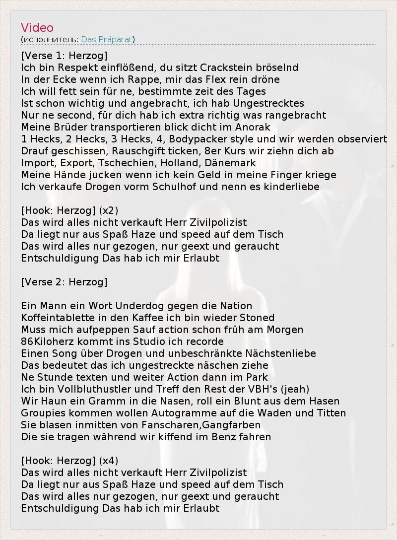 [Verse 1: Herzog] Ich bin Respekt einflößend, du sitzt Crackstein bröselnd In der Ecke wenn ich Rappe, mir das Flex rein dröne Ich will fett sein für ne, bestimmte zeit des Tages Ist schon wichtig und angebracht, ich hab Ungestrecktes Nur ne second, für dich hab ich extra richtig was rangebracht Meine Brüder transportieren blick dicht im Anorak 1 Hecks, 2 Hecks, 3 Hecks, 4, Bodypacker style und wir werden observiert Drauf geschissen, Rauschgift ticken, 8er Kurs wir ziehn dich ab Import, Export, Tschechien, Holland, Dänemark Meine Hände jucken wenn ich kein Geld in meine Finger kriege Ich verkaufe Drogen vorm Schulhof und nenn es kinderliebe [Hook: Herzog] (x2) Das wird alles nicht verkauft Herr Zivilpolizist Da liegt nur aus Spaß Haze und speed auf dem Tisch Das wird alles nur gezogen, nur geext und geraucht Entschuldigung Das hab ich mir Erlaubt [Verse 2: Herzog] Ein Mann ein Wort Underdog gegen die Nation Koffeintablette in den Kaffee ich bin wieder Stoned Muss mich aufpeppen Sauf action schon früh am Morgen 86Kiloherz kommt ins Studio ich recorde Einen Song über Drogen und unbeschränkte Nächstenliebe Das bedeutet das ich ungestreckte näschen ziehe Ne Stunde texten und weiter Action dann im Park Ich bin Vollbluthustler und Treff den Rest der VBH's (jeah) Wir Haun ein Gramm in die Nasen, roll ein Blunt aus dem Hasen Groupies kommen wollen Autogramme auf die Waden und Titten Sie blasen inmitten von Fanscharen,Gangfarben Die sie tragen während wir kiffend im Benz fahren [Hook: Herzog] (x4) Das wird alles nicht verkauft Herr Zivilpolizist Da liegt nur aus Spaß Haze und speed auf dem Tisch Das wird alles nur gezogen, nur geext und geraucht Entschuldigung Das hab ich mir Erlaubt