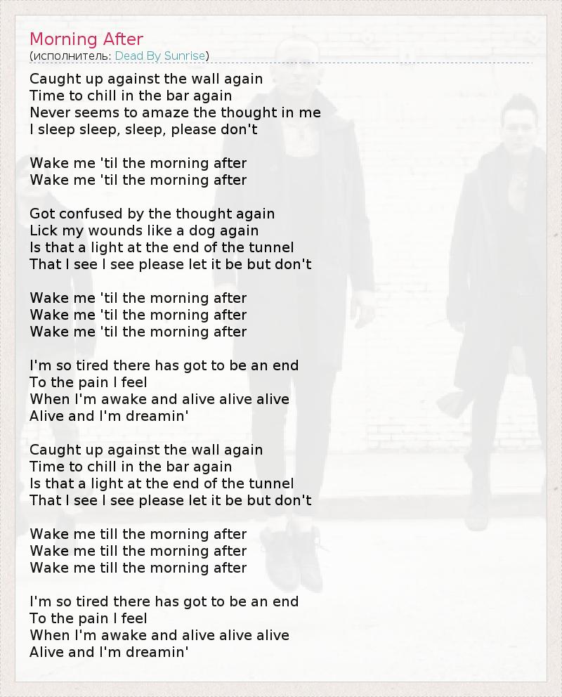Caught up against the wall again Time to chill in the bar again Never seems to amaze the thought in me I sleep sleep, sleep, please don't Wake me 'til the morning after Wake me 'til the morning after Got confused by the thought again Lick my wounds like a dog again Is that a light at the end of the tunnel That I see I see please let it be but don't Wake me 'til the morning after Wake me 'til the morning after Wake me 'til the morning after I'm so tired there has got to be an end To the pain I feel When I'm awake and alive alive alive Alive and I'm dreamin' Caught up against the wall again Time to chill in the bar again Is that a light at the end of the tunnel That I see I see please let it be but don't Wake me till the morning after Wake me till the morning after Wake me till the morning after I'm so tired there has got to be an end To the pain I feel When I'm awake and alive alive alive Alive and I'm dreamin'