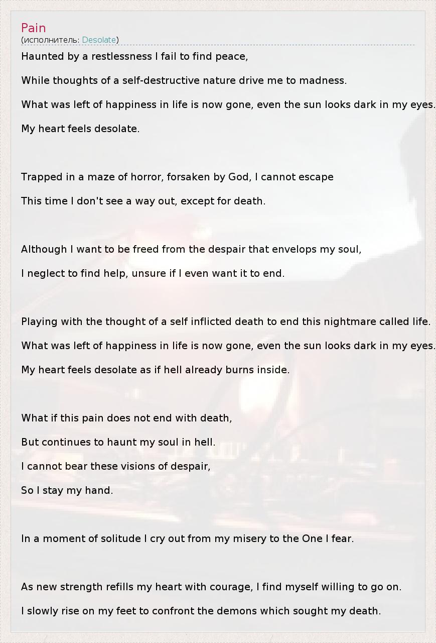 Haunted by a restlessness I fail to find peace, While thoughts of a self-destructive nature drive me to madness. What was left of happiness in life is now gone, even the sun looks dark in my eyes. My heart feels desolate. Trapped in a maze of horror, forsaken by God, I cannot escape This time I don't see a way out, except for death. Although I want to be freed from the despair that envelops my soul, I neglect to find help, unsure if I even want it to end. Playing with the thought of a self inflicted death to end this nightmare called life. What was left of happiness in life is now gone, even the sun looks dark in my eyes. My heart feels desolate as if hell already burns inside. What if this pain does not end with death, But continues to haunt my soul in hell. I cannot bear these visions of despair, So I stay my hand. In a moment of solitude I cry out from my misery to the One I fear. As new strength refills my heart with courage, I find myself willing to go on. I slowly rise on my feet to confront the demons which sought my death.