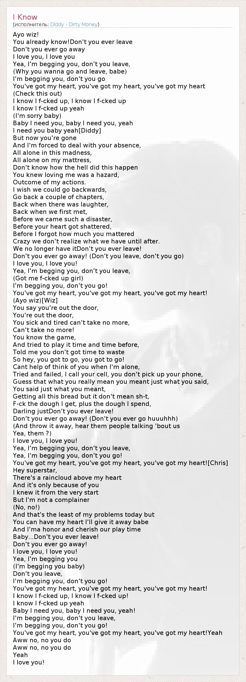 Ayo wiz! You already know!Don't you ever leave Don't you ever go away I love you, I love you Yea, I'm begging you, don't you leave, (Why you wanna go and leave, babe) I'm begging you, don't you go You've got my heart, you've got my heart, you've got my heart (Check this out) I know I f-cked up, I know I f-cked up I know I f-cked up yeah (I'm sorry baby) Baby I need you, baby I need you, yeah I need you baby yeah[Diddy] But now you're gone And I'm forced to deal with your absence, All alone in this madness, All alone on my mattress, Don't know how the hell did this happen You knew loving me was a hazard, Outcome of my actions. I wish we could go backwards, Go back a couple of chapters, Back when there was laughter, Back when we first met, Before we came such a disaster, Before your heart got shattered, Before I forgot how much you mattered Crazy we don't realize what we have until after. We no longer have itDon't you ever leave! Don't you ever go away! (Don't you leave, don't you go) I love you, I love you! Yea, I'm begging you, don't you leave, (Got me f-cked up girl) I'm begging you, don't you go! You've got my heart, you've got my heart, you've got my heart! (Ayo wiz)[Wiz] You say you're out the door, You're out the door, You sick and tired can't take no more, Can't take no more! You know the game, And tried to play it time and time before, Told me you don't got time to waste So hey, you got to go, you got to go! Cant help of think of you when I'm alone, Tried and failed, I call your cell, you don't pick up your phone, Guess that what you really mean you meant just what you said, You said just what you meant, Getting all this bread but it don't mean sh-t, F-ck the dough I get, plus the dough I spend, Darling justDon't you ever leave! Don't you ever go away! (Don't you ever go huuuhhh) (And throw it away, hear them people talking 'bout us Yea, them ?) I love you, I love you! Yea, I'm begging you, don't you leave, Yea, I'm begging you, don't you go! You've got my heart, you've got my heart, you've got my heart![Chris] Hey superstar, There's a raincloud above my heart And it's only because of you I knew it from the very start But I'm not a complainer (No, no!) And that's the least of my problems today but You can have my heart I'll give it away babe And I'ma honor and cherish our play time Baby...Don't you ever leave! Don't you ever go away! I love you, I love you! Yea, I'm begging you (I'm begging you baby) Don't you leave, I'm begging you, don't you go! You've got my heart, you've got my heart, you've got my heart! I know I f-cked up, I know I f-cked up! I know I f-cked up yeah Baby I need you, baby I need you, yeah! I'm begging you, don't you leave, I'm begging you, don't you go! You've got my heart, you've got my heart, you've got my heart!Yeah Aww no, no you do Aww no, no you do Yeah I love you!