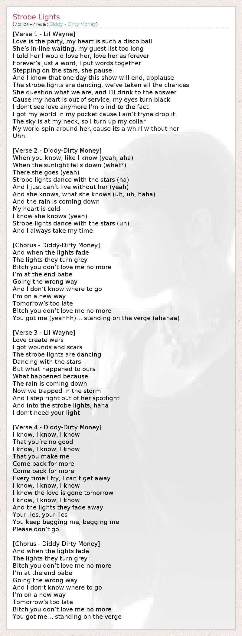 [Lil Wayne:] Любовь это вечеринка, мое сердце – диско-шар. Она в очереди перед клубом в ожидании Список моих гостей слишком длинен Я сказал ей, что буду любить ее Любить ее вечно Вечность просто слово Я составляю слова вместе Ступаем по звездам, она остановилась в нерешительности и я знаю что Однажды это шоу окончится, аплодисменты Лучи стробоскопа танцуют Мы не упустим возможности рискнуть Она спрашивает меня, что между нами? И я лишь отопью из бокала в ответ потому что Мое сердце «временно не доступно» Мои глаза стали черными Я не вижу любовь больше, я слеп к реальности Весь мир у меня в кармане и я не пытаюсь вытрясти его оттуда Небо у меня на шее, так что я поднимаю свой воротник Мой мир крутиться вокруг нее Потому что без нее в нём будет разброд [Diddy-Dirty Money:] Когда ты знаешь, как я знаю Когда солнечный свет струится вниз Вот она пришла Лучи стробоскопа танцуют со звездами И я просто не могу жить без нее И она знает то, что она знает И дождь идет Мое сердце закрыто. Я знаю, она знает Лучи стробоскопа танцуют со звездами И я всегда медлю, мне нужно время И когда лучи рассеиваются Свечение превращается в серую тьму Черт, ты не любишь меня больше Вот он и конец, детка Пошел неверной дорогой И теперь не знаю куда идти Я в новом пути Завтра – слишком поздно Черт, ты не любишь меня больше Из-за тебя я стою на краю [Lil Wayne:] Из-за любви случаются войны Я заработал раны и шрамы Лучи стробоскопа танцуют Танцуют со звездами Но что случилось с нами Это случилось потому Что дождь идет Теперь мы захвачены бурей Я шагнул в сторону из ее лучей В лучи стробоскопа Мне не нужен твой свет [Dirty Money:] Я знаю, я знаю, я знаю Что ты не правильный Я знаю, я знаю, я знаю Что ты заставишь меня вернуться снова Вернуться снова Каждый раз я пытаюсь, я не могу уйти Я знаю, любовь исчезнет завтра И лучи света рассеются Твоя ложь Ты продолжаешь молить меня, молить меня Пожалуйста, не уходи [Diddy-Dirty Money:] И когда лучи рассеиваются Свечение превращается в серую тьму Черт, ты не любишь меня больше Вот он и конец, детка Пошел неверной дорогой И теперь не знаю куда идти Я в новом пути Завтра – слишком поздно Черт, ты не любишь меня больше Из-за тебя я стою на краю Stroble lights - свет, лучи от стробоскопа - прибора, позволяющего быстро воспроизводить повторяющиеся яркие световые импульсы. Часто используется на вечеринках, дискотеках и концертах.