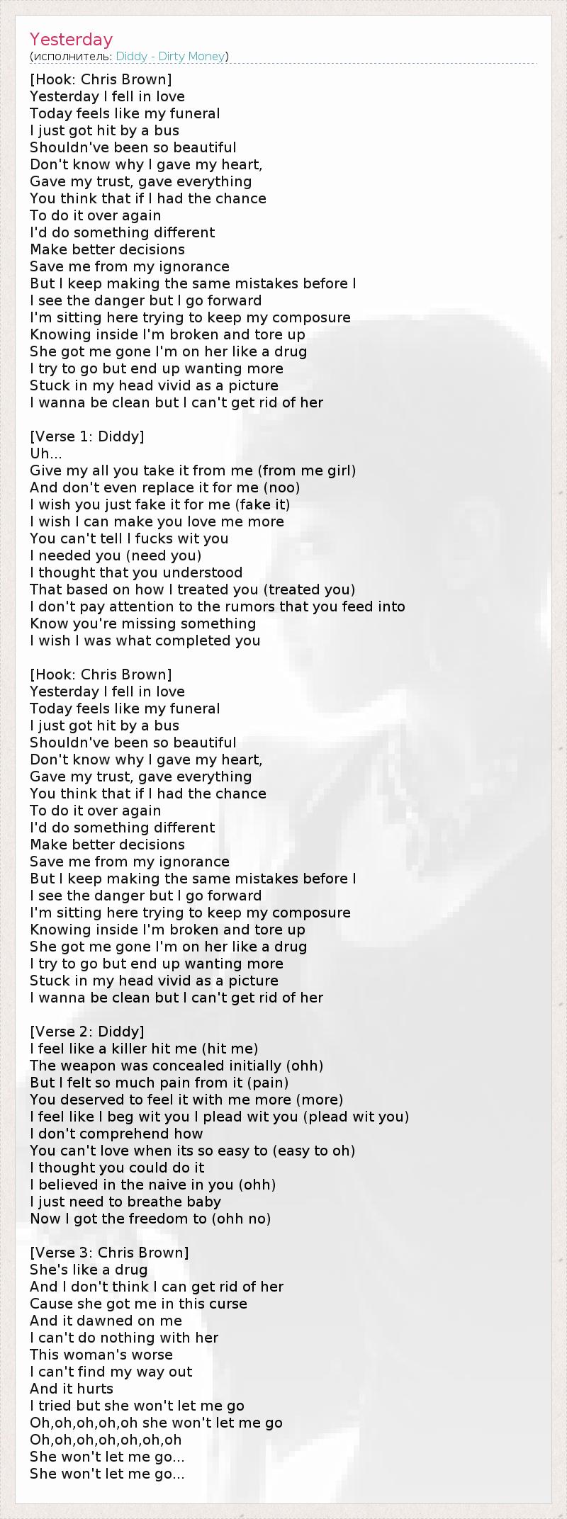 [Hook: Chris Brown] Yesterday I fell in love Today feels like my funeral I just got hit by a bus Shouldn've been so beautiful Don't know why I gave my heart, Gave my trust, gave everything You think that if I had the chance To do it over again I'd do something different Make better decisions Save me from my ignorance But I keep making the same mistakes before I I see the danger but I go forward I'm sitting here trying to keep my composure Knowing inside I'm broken and tore up She got me gone I'm on her like a drug I try to go but end up wanting more Stuck in my head vivid as a picture I wanna be clean but I can't get rid of her [Verse 1: Diddy] Uh... Give my all you take it from me (from me girl) And don't even replace it for me (noo) I wish you just fake it for me (fake it) I wish I can make you love me more You can't tell I fucks wit you I needed you (need you) I thought that you understood That based on how I treated you (treated you) I don't pay attention to the rumors that you feed into Know you're missing something I wish I was what completed you [Hook: Chris Brown] Yesterday I fell in love Today feels like my funeral I just got hit by a bus Shouldn've been so beautiful Don't know why I gave my heart, Gave my trust, gave everything You think that if I had the chance To do it over again I'd do something different Make better decisions Save me from my ignorance But I keep making the same mistakes before I I see the danger but I go forward I'm sitting here trying to keep my composure Knowing inside I'm broken and tore up She got me gone I'm on her like a drug I try to go but end up wanting more Stuck in my head vivid as a picture I wanna be clean but I can't get rid of her [Verse 2: Diddy] I feel like a killer hit me (hit me) The weapon was concealed initially (ohh) But I felt so much pain from it (pain) You deserved to feel it with me more (more) I feel like I beg wit you I plead wit you (plead wit you) I don't comprehend how You can't love when its so easy to (easy to oh) I thought you could do it I believed in the naive in you (ohh) I just need to breathe baby Now I got the freedom to (ohh no) [Verse 3: Chris Brown] She's like a drug And I don't think I can get rid of her Cause she got me in this curse And it dawned on me I can't do nothing with her This woman's worse I can't find my way out And it hurts I tried but she won't let me go Oh,oh,oh,oh,oh she won't let me go Oh,oh,oh,oh,oh,oh,oh She won't let me go... She won't let me go...