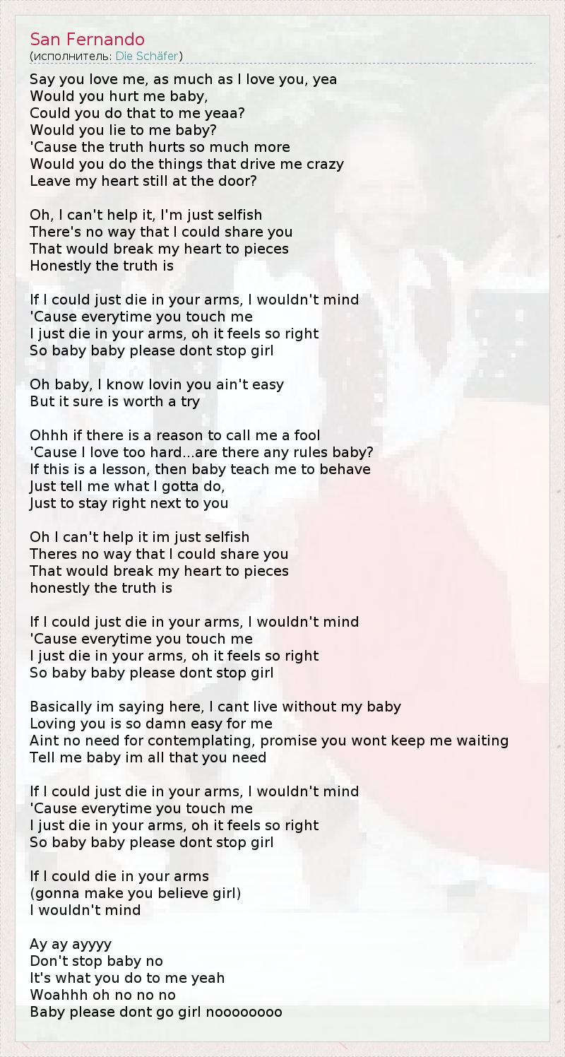 Say you love me, as much as I love you, yea Would you hurt me baby, Could you do that to me yeaa? Would you lie to me baby? 'Cause the truth hurts so much more Would you do the things that drive me crazy Leave my heart still at the door? Oh, I can't help it, I'm just selfish There's no way that I could share you That would break my heart to pieces Honestly the truth is If I could just die in your arms, I wouldn't mind 'Cause everytime you touch me I just die in your arms, oh it feels so right So baby baby please dont stop girl Oh baby, I know lovin you ain't easy But it sure is worth a try Ohhh if there is a reason to call me a fool 'Cause I love too hard...are there any rules baby? If this is a lesson, then baby teach me to behave Just tell me what I gotta do, Just to stay right next to you Oh I can't help it im just selfish Theres no way that I could share you That would break my heart to pieces honestly the truth is If I could just die in your arms, I wouldn't mind 'Cause everytime you touch me I just die in your arms, oh it feels so right So baby baby please dont stop girl Basically im saying here, I cant live without my baby Loving you is so damn easy for me Aint no need for contemplating, promise you wont keep me waiting Tell me baby im all that you need If I could just die in your arms, I wouldn't mind 'Cause everytime you touch me I just die in your arms, oh it feels so right So baby baby please dont stop girl If I could die in your arms (gonna make you believe girl) I wouldn't mind Ay ay ayyyy Don't stop baby no It's what you do to me yeah Woahhh oh no no no Baby please dont go girl noooooooo