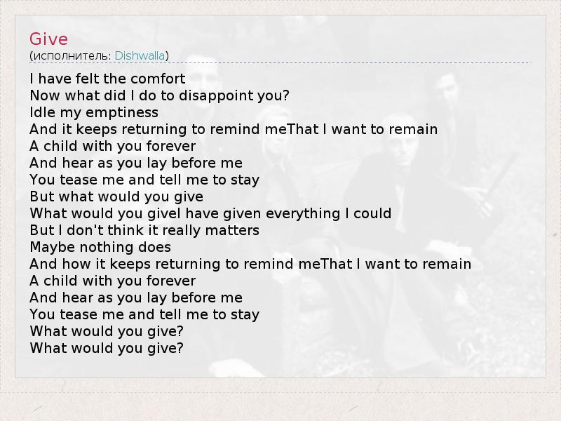 I have felt the comfort Now what did I do to disappoint you? Idle my emptiness And it keeps returning to remind meThat I want to remain A child with you forever And hear as you lay before me You tease me and tell me to stay But what would you give What would you giveI have given everything I could But I don't think it really matters Maybe nothing does And how it keeps returning to remind meThat I want to remain A child with you forever And hear as you lay before me You tease me and tell me to stay What would you give? What would you give?