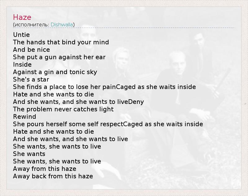 Untie The hands that bind your mind And be nice She put a gun against her ear Inside Against a gin and tonic sky She's a star She finds a place to lose her painCaged as she waits inside Hate and she wants to die And she wants, and she wants to liveDeny The problem never catches light Rewind She pours herself some self respectCaged as she waits inside Hate and she wants to die And she wants, and she wants to live She wants, she wants to live She wants She wants, she wants to live Away from this haze Away back from this haze