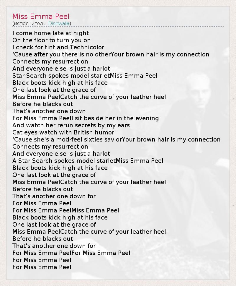 I come home late at night On the floor to turn you on I check for tint and Technicolor 'Cause after you there is no otherYour brown hair is my connection Connects my resurrection And everyone else is just a harlot Star Search spokes model starletMiss Emma Peel Black boots kick high at his face One last look at the grace of Miss Emma PeelCatch the curve of your leather heel Before he blacks out That's another one down For Miss Emma PeelI sit beside her in the evening And watch her rerun secrets by my ears Cat eyes watch with British humor 'Cause she's a mod-feel sixties saviorYour brown hair is my connection Connects my resurrection And everyone else is just a harlot A Star Search spokes model starletMiss Emma Peel Black boots kick high at his face One last look at the grace of Miss Emma PeelCatch the curve of your leather heel Before he blacks out That's another one down for For Miss Emma Peel For Miss Emma PeelMiss Emma Peel Black boots kick high at his face One last look at the grace of Miss Emma PeelCatch the curve of your leather heel Before he blacks out That's another one down for For Miss Emma PeelFor Miss Emma Peel For Miss Emma Peel For Miss Emma Peel