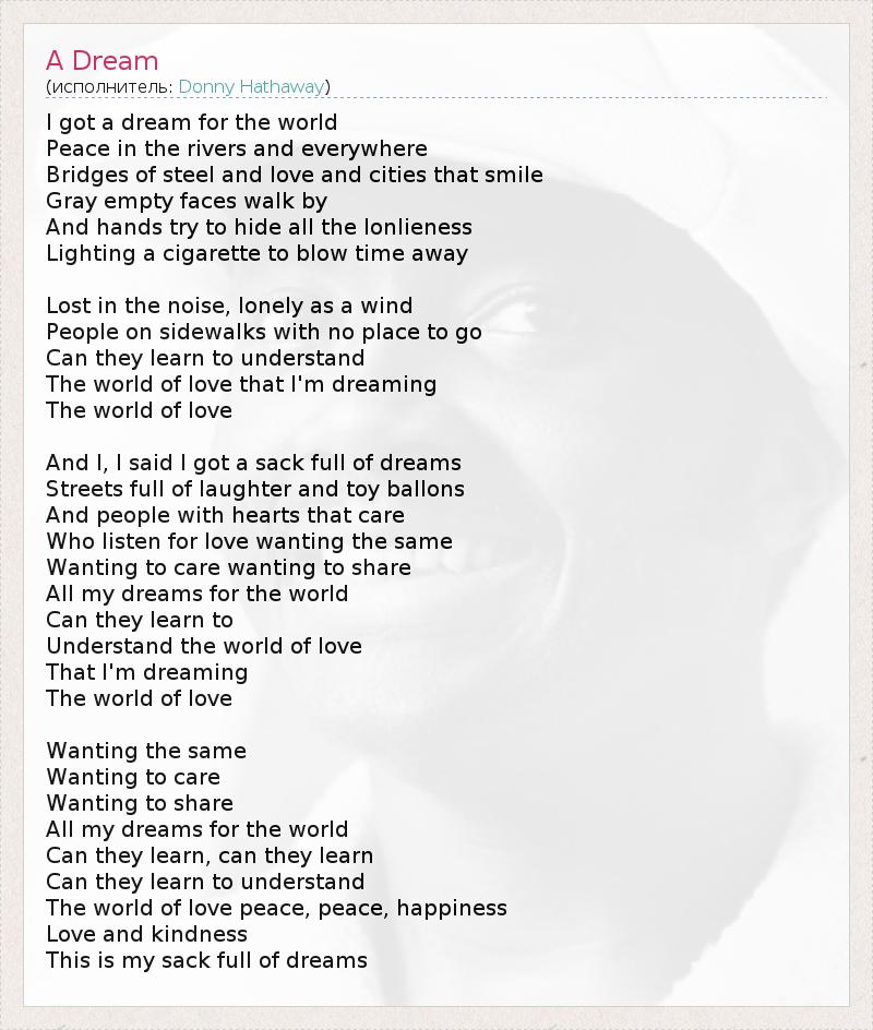 I got a dream for the world Peace in the rivers and everywhere Bridges of steel and love and cities that smile Gray empty faces walk by And hands try to hide all the lonlieness Lighting a cigarette to blow time away Lost in the noise, lonely as a wind People on sidewalks with no place to go Can they learn to understand The world of love that I'm dreaming The world of love And I, I said I got a sack full of dreams Streets full of laughter and toy ballons And people with hearts that care Who listen for love wanting the same Wanting to care wanting to share All my dreams for the world Can they learn to Understand the world of love That I'm dreaming The world of love Wanting the same Wanting to care Wanting to share All my dreams for the world Can they learn, can they learn Can they learn to understand The world of love peace, peace, happiness Love and kindness This is my sack full of dreams