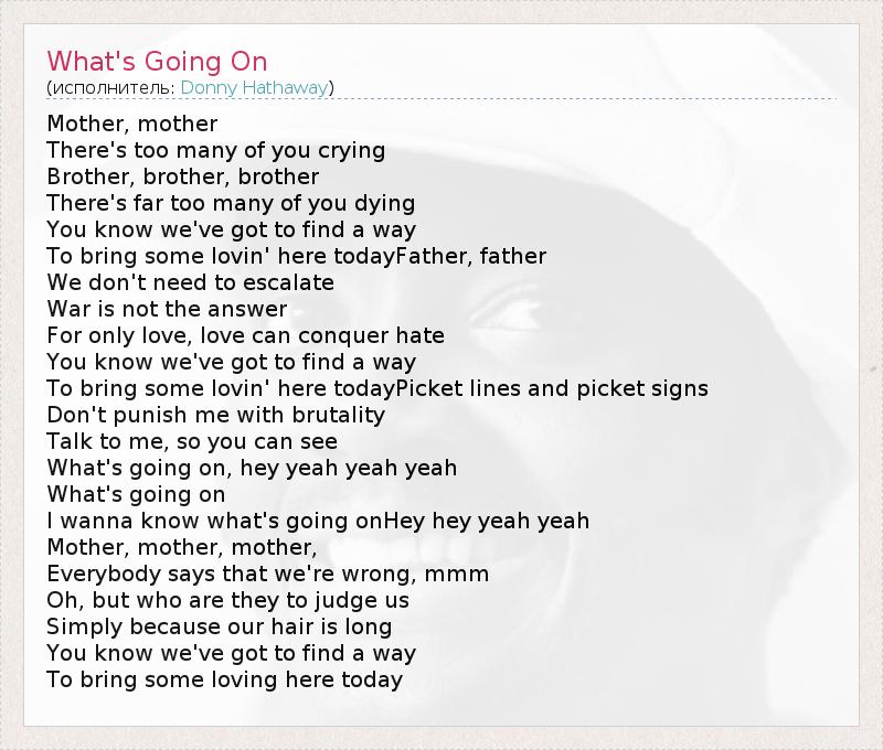 Mother, mother There's too many of you crying Brother, brother, brother There's far too many of you dying You know we've got to find a way To bring some lovin' here todayFather, father We don't need to escalate War is not the answer For only love, love can conquer hate You know we've got to find a way To bring some lovin' here todayPicket lines and picket signs Don't punish me with brutality Talk to me, so you can see What's going on, hey yeah yeah yeah What's going on I wanna know what's going onHey hey yeah yeah Mother, mother, mother, Everybody says that we're wrong, mmm Oh, but who are they to judge us Simply because our hair is long You know we've got to find a way To bring some loving here today