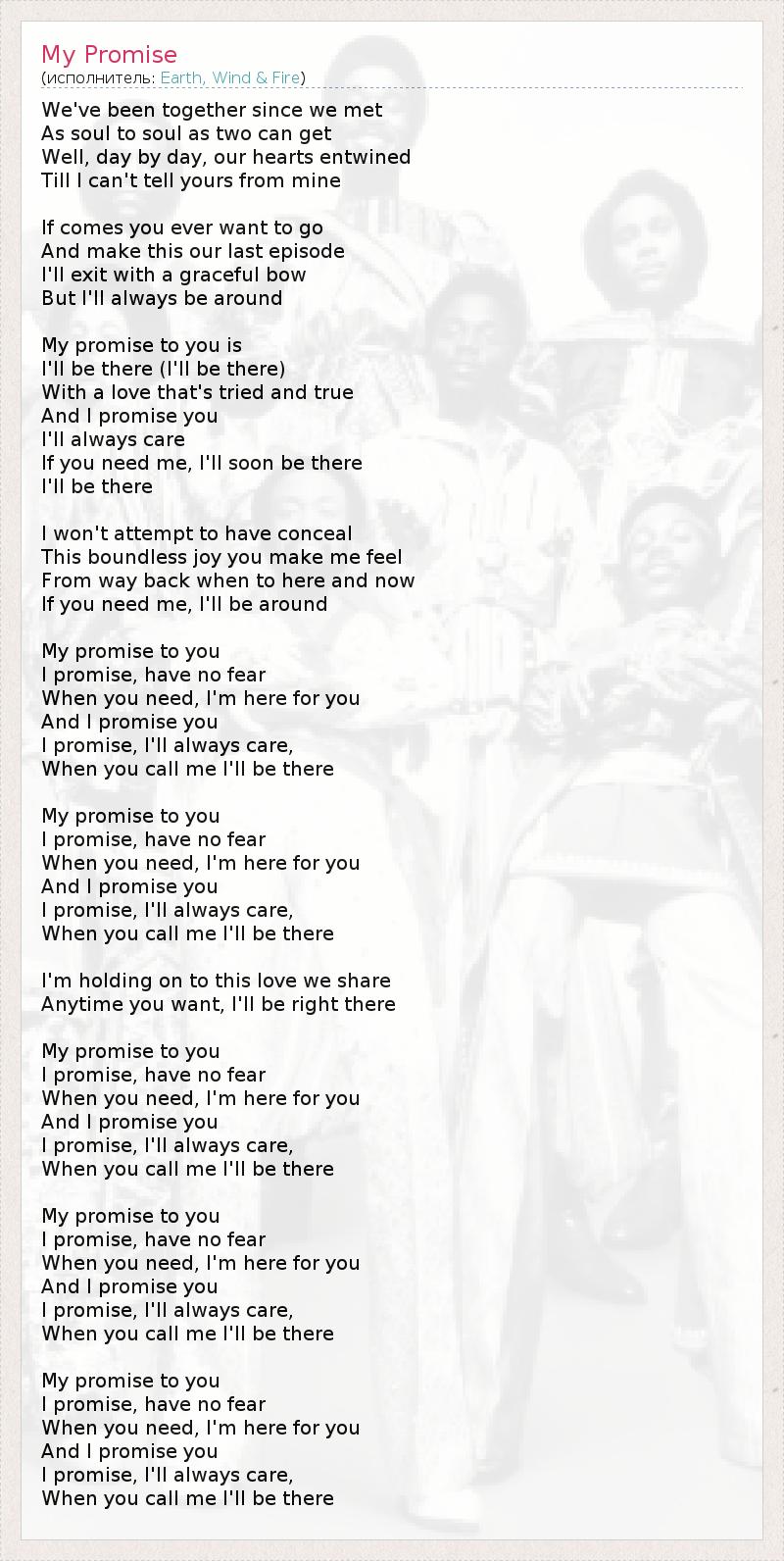 Мы вместе с той поры, как повстречались, Душа с душой так тесно сплетены, И день за днем сердца в одно сливались, Пока отличья стали не видны. И если вдруг захочешь ты уйти, Историю любви венчав прощаньем, Изящно поклонюсь, но всё ж прости, Всегда я буду рядом, обещаю. Я обещаю Быть с тобой везде (буду я с тобой) С любовью искренной и неугасшей. И обещаю, Что в любой беде, Приду на помощь ради встречи нашей Буду я с тобой. Не стану я скрывать, с тобой я безграничное испытываю счастье. Сквозь времена, знай, в день и час любой Я буду рядом при любом ненастье. Я обещаю, Что отрину страх любой, Лишь позови и буду я с тобой. И обещаю, коли встретишься с бедой, Приду на помощь, я всегда с тобой. Я обещаю, Что отрину страх любой, Лишь позови и буду я с тобой. И обещаю, коли встретишься с бедой, Приду на помощь, я всегда с тобой. Я буду биться за любовь, что есть у нас. Лишь пожелай, я буду рядом в тот же час. Я обещаю, Что отрину страх любой, Лишь позови и буду я с тобой. И обещаю, коли встретишься с бедой, Приду на помощь, я всегда с тобой. Я обещаю, Что отрину страх любой, Лишь позови и буду я с тобой. И обещаю, коли встретишься с бедой, Приду на помощь, я всегда с тобой. Я обещаю, Что отрину страх любой, Лишь позови и буду я с тобой. И обещаю, коли встретишься с бедой, Приду на помощь, я всегда с тобой. * поэтический перевод с элементами творческой интерпретации