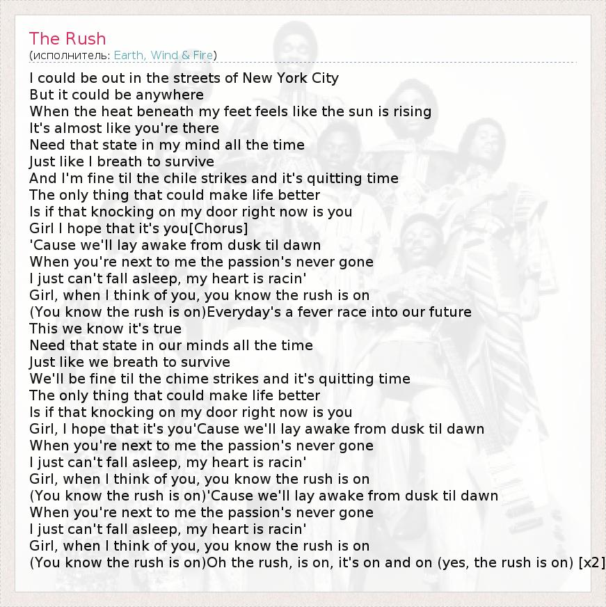 I could be out in the streets of New York City But it could be anywhere When the heat beneath my feet feels like the sun is rising It's almost like you're there Need that state in my mind all the time Just like I breath to survive And I'm fine til the chile strikes and it's quitting time The only thing that could make life better Is if that knocking on my door right now is you Girl I hope that it's you[Chorus] 'Cause we'll lay awake from dusk til dawn When you're next to me the passion's never gone I just can't fall asleep, my heart is racin' Girl, when I think of you, you know the rush is on (You know the rush is on)Everyday's a fever race into our future This we know it's true Need that state in our minds all the time Just like we breath to survive We'll be fine til the chime strikes and it's quitting time The only thing that could make life better Is if that knocking on my door right now is you Girl, I hope that it's you'Cause we'll lay awake from dusk til dawn When you're next to me the passion's never gone I just can't fall asleep, my heart is racin' Girl, when I think of you, you know the rush is on (You know the rush is on)'Cause we'll lay awake from dusk til dawn When you're next to me the passion's never gone I just can't fall asleep, my heart is racin' Girl, when I think of you, you know the rush is on (You know the rush is on)Oh the rush, is on, it's on and on (yes, the rush is on) [x2]