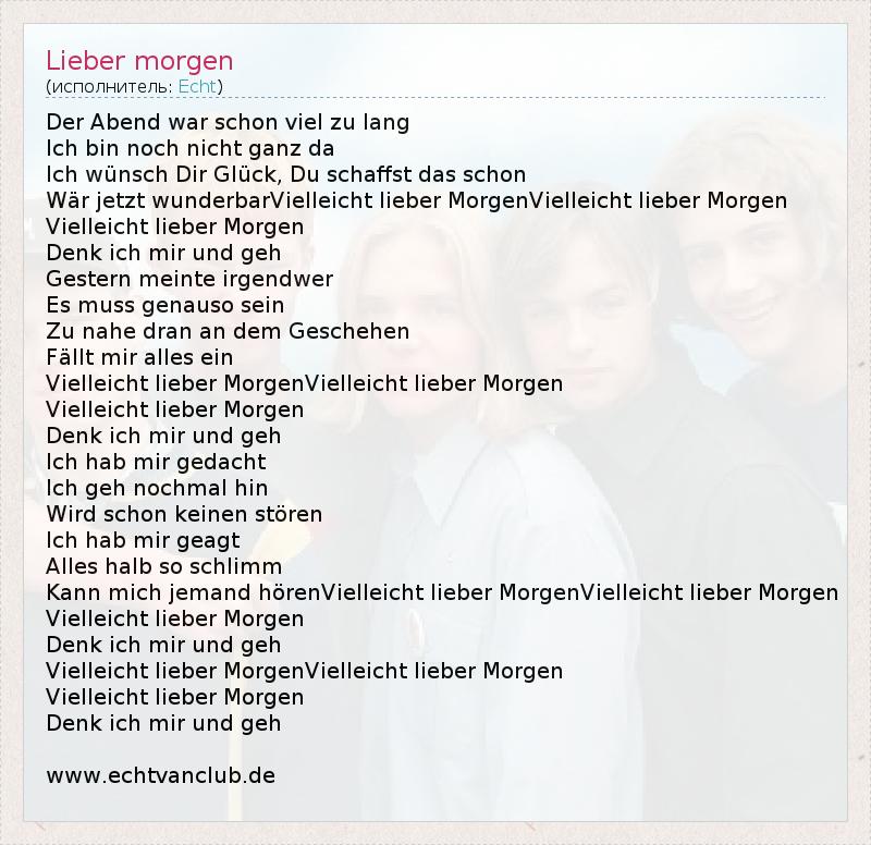 Der Abend war schon viel zu lang Ich bin noch nicht ganz da Ich wünsch Dir Glück, Du schaffst das schon Wär jetzt wunderbarVielleicht lieber MorgenVielleicht lieber Morgen Vielleicht lieber Morgen Denk ich mir und geh Gestern meinte irgendwer Es muss genauso sein Zu nahe dran an dem Geschehen Fällt mir alles ein Vielleicht lieber MorgenVielleicht lieber Morgen Vielleicht lieber Morgen Denk ich mir und geh Ich hab mir gedacht Ich geh nochmal hin Wird schon keinen stören Ich hab mir geagt Alles halb so schlimm Kann mich jemand hörenVielleicht lieber MorgenVielleicht lieber Morgen Vielleicht lieber Morgen Denk ich mir und geh Vielleicht lieber MorgenVielleicht lieber Morgen Vielleicht lieber Morgen Denk ich mir und geh www.echtvanclub.de