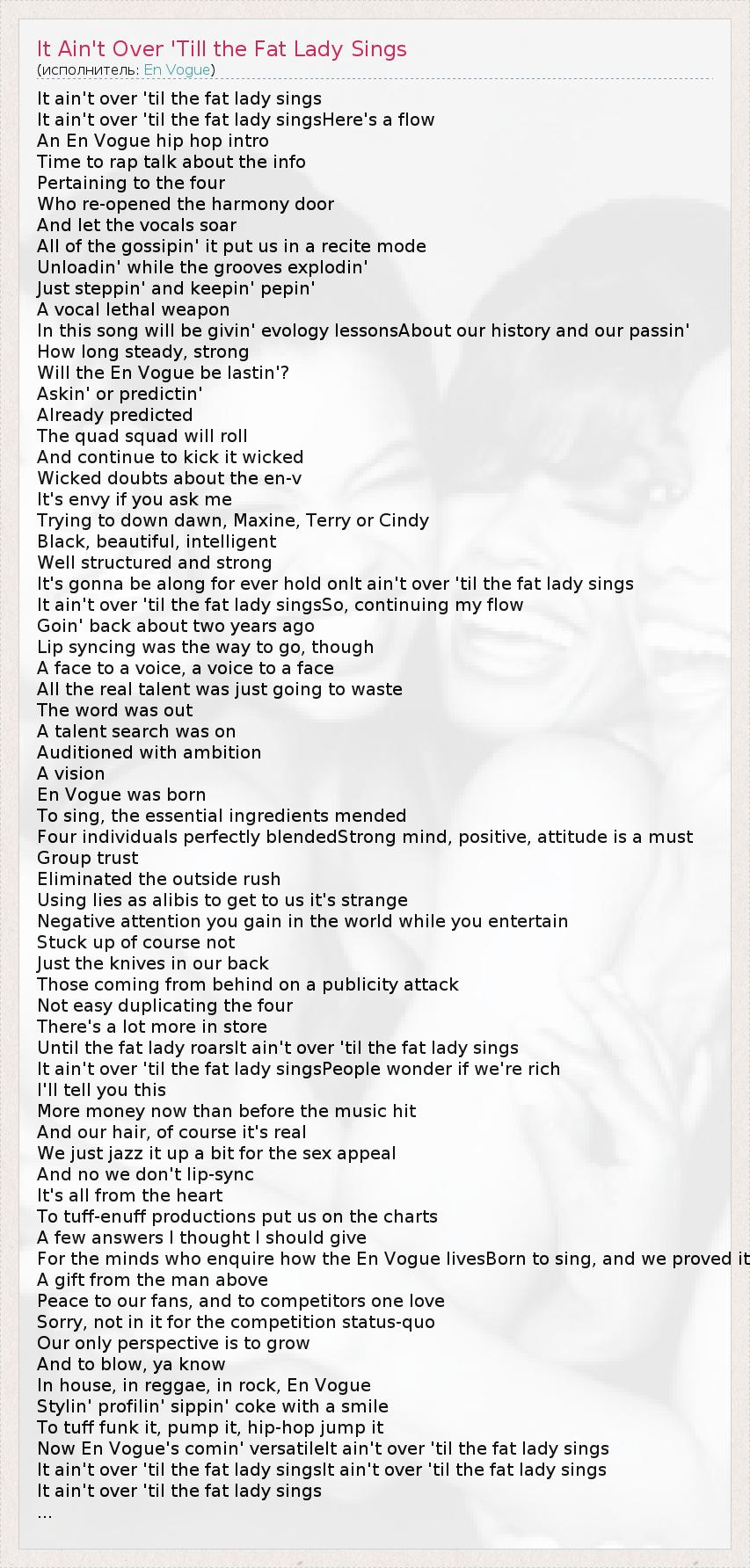 It ain't over 'til the fat lady sings It ain't over 'til the fat lady singsHere's a flow An En Vogue hip hop intro Time to rap talk about the info Pertaining to the four Who re-opened the harmony door And let the vocals soar All of the gossipin' it put us in a recite mode Unloadin' while the grooves explodin' Just steppin' and keepin' pepin' A vocal lethal weapon In this song will be givin' evology lessonsAbout our history and our passin' How long steady, strong Will the En Vogue be lastin'? Askin' or predictin' Already predicted The quad squad will roll And continue to kick it wicked Wicked doubts about the en-v It's envy if you ask me Trying to down dawn, Maxine, Terry or Cindy Black, beautiful, intelligent Well structured and strong It's gonna be along for ever hold onIt ain't over 'til the fat lady sings It ain't over 'til the fat lady singsSo, continuing my flow Goin' back about two years ago Lip syncing was the way to go, though A face to a voice, a voice to a face All the real talent was just going to waste The word was out A talent search was on Auditioned with ambition A vision En Vogue was born To sing, the essential ingredients mended Four individuals perfectly blendedStrong mind, positive, attitude is a must Group trust Eliminated the outside rush Using lies as alibis to get to us it's strange Negative attention you gain in the world while you entertain Stuck up of course not Just the knives in our back Those coming from behind on a publicity attack Not easy duplicating the four There's a lot more in store Until the fat lady roarsIt ain't over 'til the fat lady sings It ain't over 'til the fat lady singsPeople wonder if we're rich I'll tell you this More money now than before the music hit And our hair, of course it's real We just jazz it up a bit for the sex appeal And no we don't lip-sync It's all from the heart To tuff-enuff productions put us on the charts A few answers I thought I should give For the minds who enquire how the En Vogue livesBorn to sing, and we proved it A gift from the man above Peace to our fans, and to competitors one love Sorry, not in it for the competition status-quo Our only perspective is to grow And to blow, ya know In house, in reggae, in rock, En Vogue Stylin' profilin' sippin' coke with a smile To tuff funk it, pump it, hip-hop jump it Now En Vogue's comin' versatileIt ain't over 'til the fat lady sings It ain't over 'til the fat lady singsIt ain't over 'til the fat lady sings It ain't over 'til the fat lady sings ...