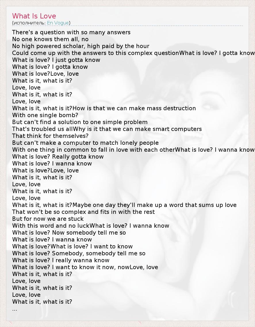 There's a question with so many answers No one knows them all, no No high powered scholar, high paid by the hour Could come up with the answers to this complex questionWhat is love? I gotta know What is love? I just gotta know What is love? I gotta know What is love?Love, love What is it, what is it? Love, love What is it, what is it? Love, love What is it, what is it?How is that we can make mass destruction With one single bomb? But can't find a solution to one simple problem That's troubled us allWhy is it that we can make smart computers That think for themselves? But can't make a computer to match lonely people With one thing in common to fall in love with each otherWhat is love? I wanna know What is love? Really gotta know What is love? I wanna know What is love?Love, love What is it, what is it? Love, love What is it, what is it? Love, love What is it, what is it?Maybe one day they'll make up a word that sums up love That won't be so complex and fits in with the rest But for now we are stuck With this word and no luckWhat is love? I wanna know What is love? Now somebody tell me so What is love? I wanna know What is love?What is love? I want to know What is love? Somebody, somebody tell me so What is love? I really wanna know What is love? I want to know it now, nowLove, love What is it, what is it? Love, love What is it, what is it? Love, love What is it, what is it? ...