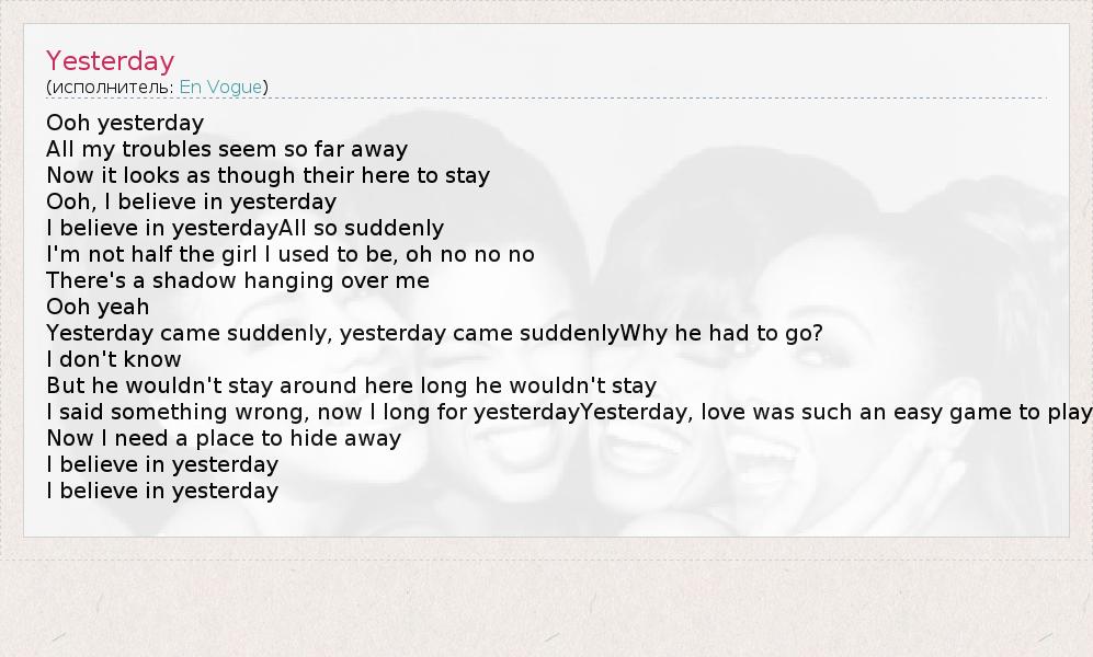 Ooh yesterday All my troubles seem so far away Now it looks as though their here to stay Ooh, I believe in yesterday I believe in yesterdayAll so suddenly I'm not half the girl I used to be, oh no no no There's a shadow hanging over me Ooh yeah Yesterday came suddenly, yesterday came suddenlyWhy he had to go? I don't know But he wouldn't stay around here long he wouldn't stay I said something wrong, now I long for yesterdayYesterday, love was such an easy game to play Now I need a place to hide away I believe in yesterday I believe in yesterday