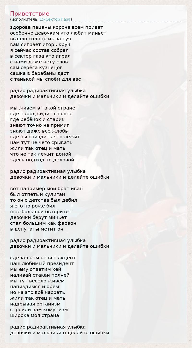 здорова пацаны короче всем привет особенно девочкам кто любит миньет вышло солнце из-за туч вам сиграет игорь круч я сейчас состав собрал в сектор газа кто играл с нами даже нету слов сам серёга кузнецов сашка в барабаны даст с танькой мы споём для вас радио радиоактивная улыбка девочки и мальчики н делайте ошибки мы живём в такой стране где народ сидит в говне где ребёнок и старик знают точно на примиг знают даже все жлобы где бы спиздить что лежит нам тут не чего срывать жили так отец и мать что не так лежит домой здесь подход то деловой радио радиоактивная улыбка девочки и мальчики н делайте ошибки вот например мой брат иван был отпетый хулиган то он с детства был дебил я его по роже бил щас большой овторитет девочки берут миньет стал большим как фараон в депутаты метит он радио радиоактивная улыбка девочки и мальчики н делайте ошибки сделал нам на всё акцент наш любимый президент мы ему ответим хей наливай стакан полней мы тут весело живём напиздимся и орём но на это всё насрать жили так отец и мать надрывая организм строили вам комунизм широка моя страна радио радиоактивная улыбка девочки и мальчики н делайте ошибки