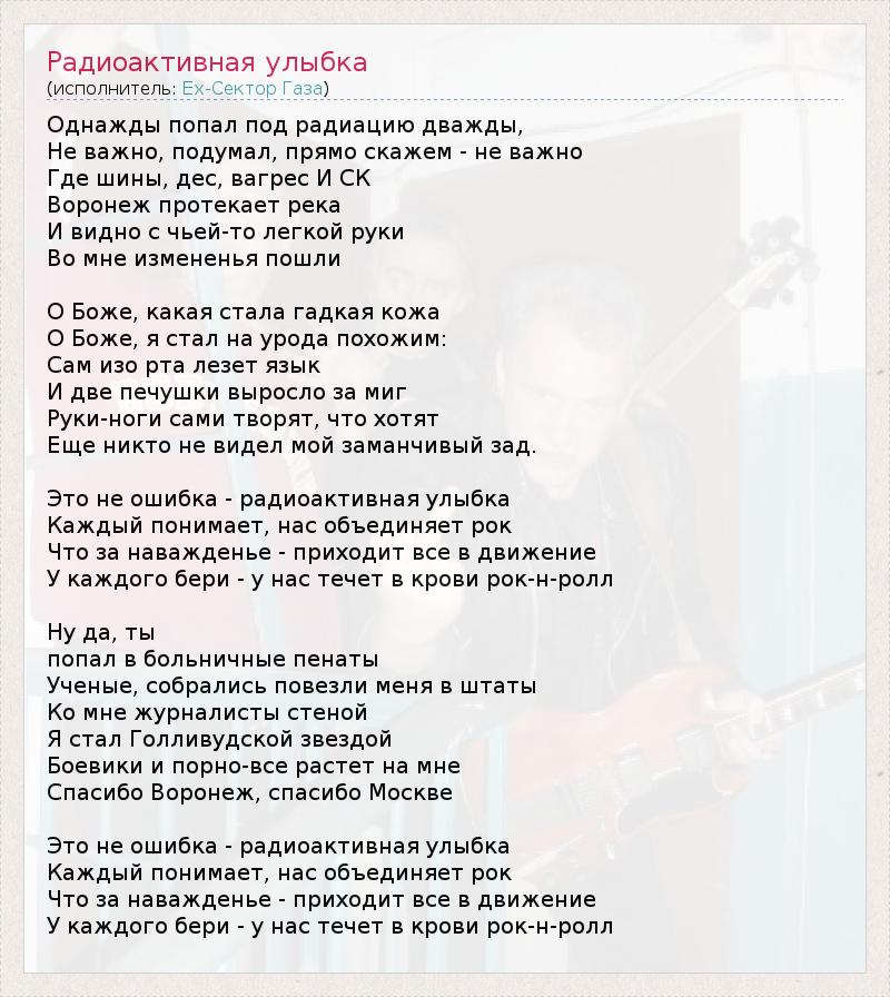 Однажды попал под радиацию дважды, Не важно, подумал, прямо скажем - не важно Где шины, дес, вагрес И CК Воронеж протекает река И видно с чьей-то легкой руки Во мне измененья пошли О Боже, какая стала гадкая кожа О Боже, я стал на урода похожим: Сам изо рта лезет язык И две печушки выросло за миг Руки-ноги сами творят, что хотят Еще никто не видел мой заманчивый зад. Это не ошибка - радиоактивная улыбка Каждый понимает, нас объединяет рок Что за наважденье - приходит все в движение У каждого бери - у нас течет в крови рок-н-ролл Ну да, ты попал в больничные пенаты Ученые, собрались повезли меня в штаты Ко мне журналисты стеной Я стал Голливудской звездой Боевики и порно-все растет на мне Спасибо Воронеж, спасибо Москве Это не ошибка - радиоактивная улыбка Каждый понимает, нас объединяет рок Что за наважденье - приходит все в движение У каждого бери - у нас течет в крови рок-н-ролл