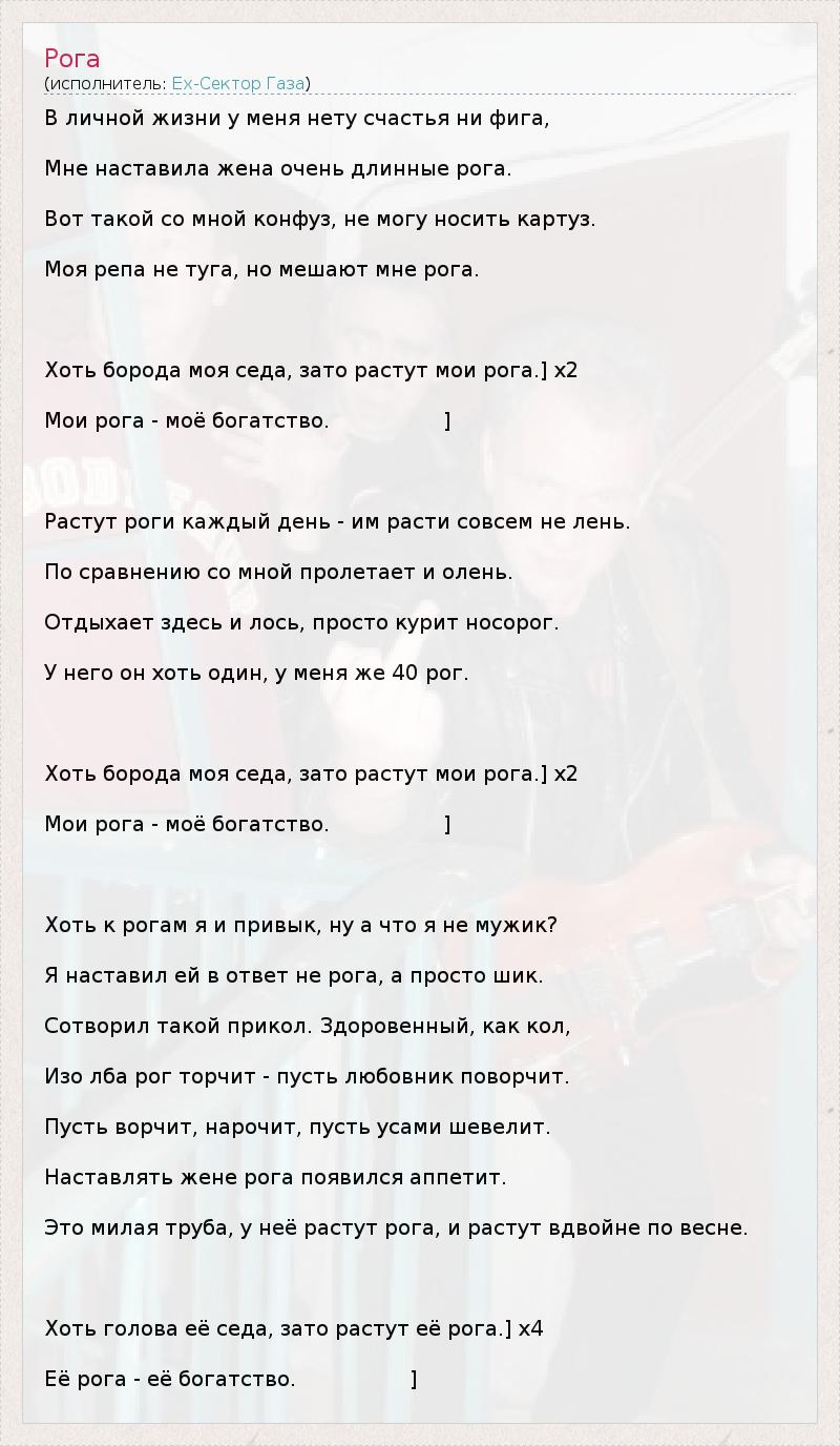 В личной жизни у меня нету счастья ни фига, Мне наставила жена очень длинные рога. Вот такой со мной конфуз, не могу носить картуз. Моя репа не туга, но мешают мне рога. Хоть борода моя седа, зато растут мои рога.] х2 Мои рога - моё богатство. ] Растут роги каждый день - им расти совсем не лень. По сравнению со мной пролетает и олень. Отдыхает здесь и лось, просто курит носорог. У него он хоть один, у меня же 40 рог. Хоть борода моя седа, зато растут мои рога.] х2 Мои рога - моё богатство. ] Хоть к рогам я и привык, ну а что я не мужик? Я наставил ей в ответ не рога, а просто шик. Сотворил такой прикол. Здоровенный, как кол, Изо лба рог торчит - пусть любовник поворчит. Пусть ворчит, нарочит, пусть усами шевелит. Наставлять жене рога появился аппетит. Это милая труба, у неё растут рога, и растут вдвойне по весне. Хоть голова её седа, зато растут её рога.] x4 Её рога - её богатство. ]