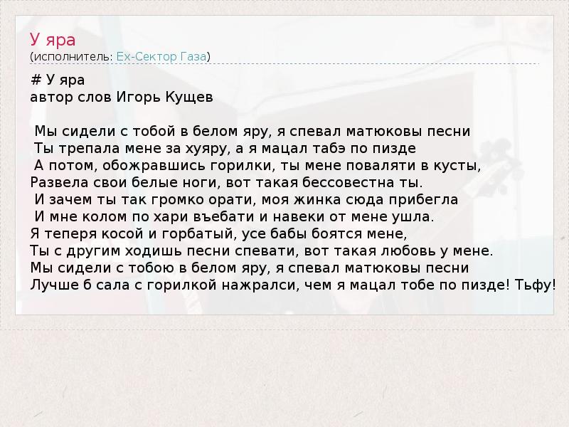 # У яра автор слов Игорь Кущев Мы сидели с тобой в белом яру, я спевал матюковы песни Ты трепала мене за хуяру, а я мацал табэ по пизде А потом, обожравшись горилки, ты мене поваляти в кусты, Развела свои белые ноги, вот такая бессовестна ты. И зачем ты так громко орати, моя жинка сюда прибегла И мне колом по хари въебати и навеки от мене ушла. Я теперя косой и горбатый, усе бабы боятся мене, Ты с другим ходишь песни спевати, вот такая любовь у мене. Мы сидели с тобою в белом яру, я спевал матюковы песни Лучше б сала с горилкой нажралси, чем я мацал тобе по пизде! Тьфу!
