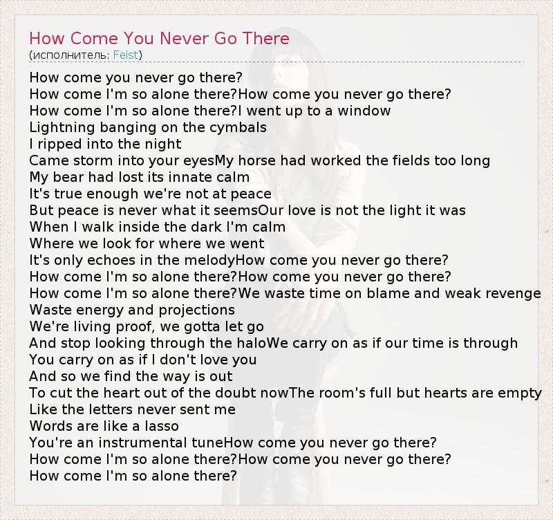 How come you never go there? How come I'm so alone there?How come you never go there? How come I'm so alone there?I went up to a window Lightning banging on the cymbals I ripped into the night Came storm into your eyesMy horse had worked the fields too long My bear had lost its innate calm It's true enough we're not at peace But peace is never what it seemsOur love is not the light it was When I walk inside the dark I'm calm Where we look for where we went It's only echoes in the melodyHow come you never go there? How come I'm so alone there?How come you never go there? How come I'm so alone there?We waste time on blame and weak revenge Waste energy and projections We're living proof, we gotta let go And stop looking through the haloWe carry on as if our time is through You carry on as if I don't love you And so we find the way is out To cut the heart out of the doubt nowThe room's full but hearts are empty Like the letters never sent me Words are like a lasso You're an instrumental tuneHow come you never go there? How come I'm so alone there?How come you never go there? How come I'm so alone there?