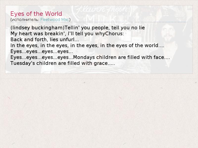 (lindsey buckingham)Tellin' you people, tell you no lie My heart was breakin', I'll tell you whyChorus: Back and forth, lies unfurl... In the eyes, in the eyes, in the eyes, in the eyes of the world.... Eyes...eyes...eyes...eyes... Eyes...eyes...eyes...eyes...Mondays children are filled with face.... Tuesday's children are filled with grace.....