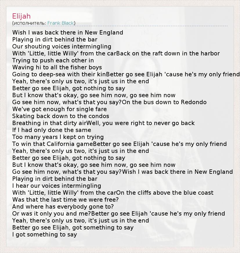 Or was it only you and me?Better go see Elijah 'cause he's my only friend