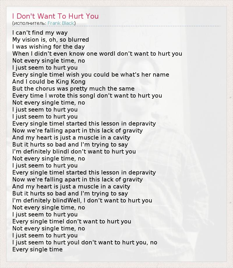 I can't find my way My vision is, oh, so blurred I was wishing for the day When I didn't even know one wordI don't want to hurt you Not every single time, no I just seem to hurt you Every single timeI wish you could be what's her name And I could be King Kong But the chorus was pretty much the same Every time I wrote this songI don't want to hurt you Not every single time, no I just seem to hurt you I just seem to hurt you Every single timeI started this lesson in depravity Now we're falling apart in this lack of gravity And my heart is just a muscle in a cavity But it hurts so bad and I'm trying to say I'm definitely blindI don't want to hurt you Not every single time, no I just seem to hurt you Every single timeI started this lesson in depravity Now we're falling apart in this lack of gravity And my heart is just a muscle in a cavity But it hurts so bad and I'm trying to say I'm definitely blindWell, I don't want to hurt you Not every single time, no I just seem to hurt you Every single timeI don't want to hurt you Not every single time, no I just seem to hurt you I just seem to hurt youI don't want to hurt you, no Every single time