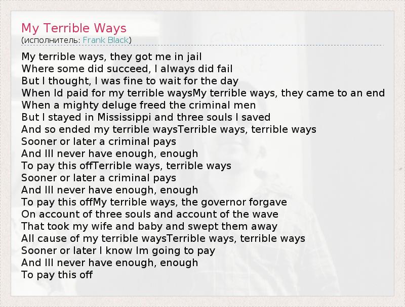 My terrible ways, they got me in jail Where some did succeed, I always did fail But I thought, I was fine to wait for the day When Id paid for my terrible waysMy terrible ways, they came to an end When a mighty deluge freed the criminal men But I stayed in Mississippi and three souls I saved And so ended my terrible waysTerrible ways, terrible ways Sooner or later a criminal pays And Ill never have enough, enough To pay this offTerrible ways, terrible ways Sooner or later a criminal pays And Ill never have enough, enough To pay this offMy terrible ways, the governor forgave On account of three souls and account of the wave That took my wife and baby and swept them away All cause of my terrible waysTerrible ways, terrible ways Sooner or later I know Im going to pay And Ill never have enough, enough To pay this off